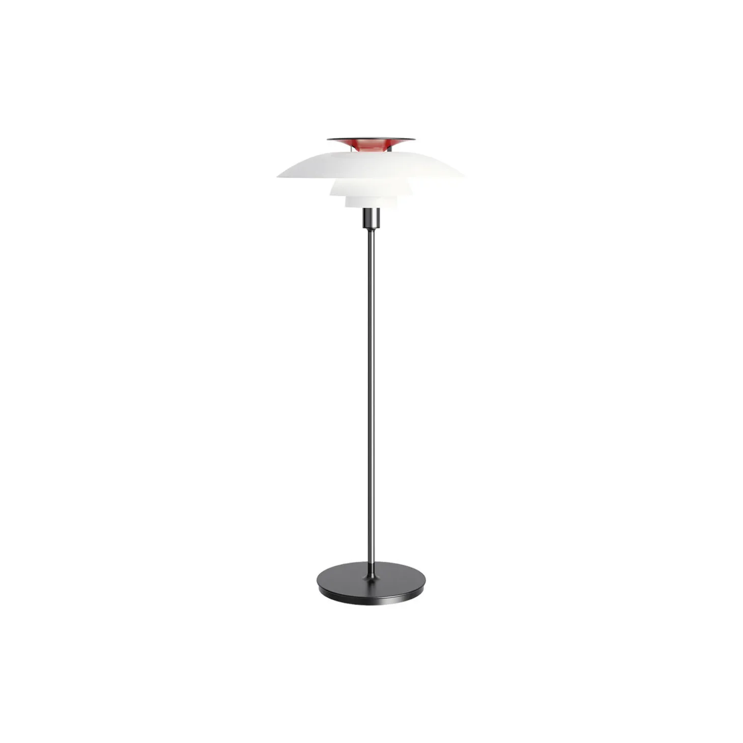 PH 80 gulvlampe i akryl og polykarbonat med stander i højglansforkromet stål fra Louis Poulsen. Farve: hvid. Mål: H: 131,5 x Ø 55 cm. Lyskilde: 70W E27. Design: Poul Henningsen.