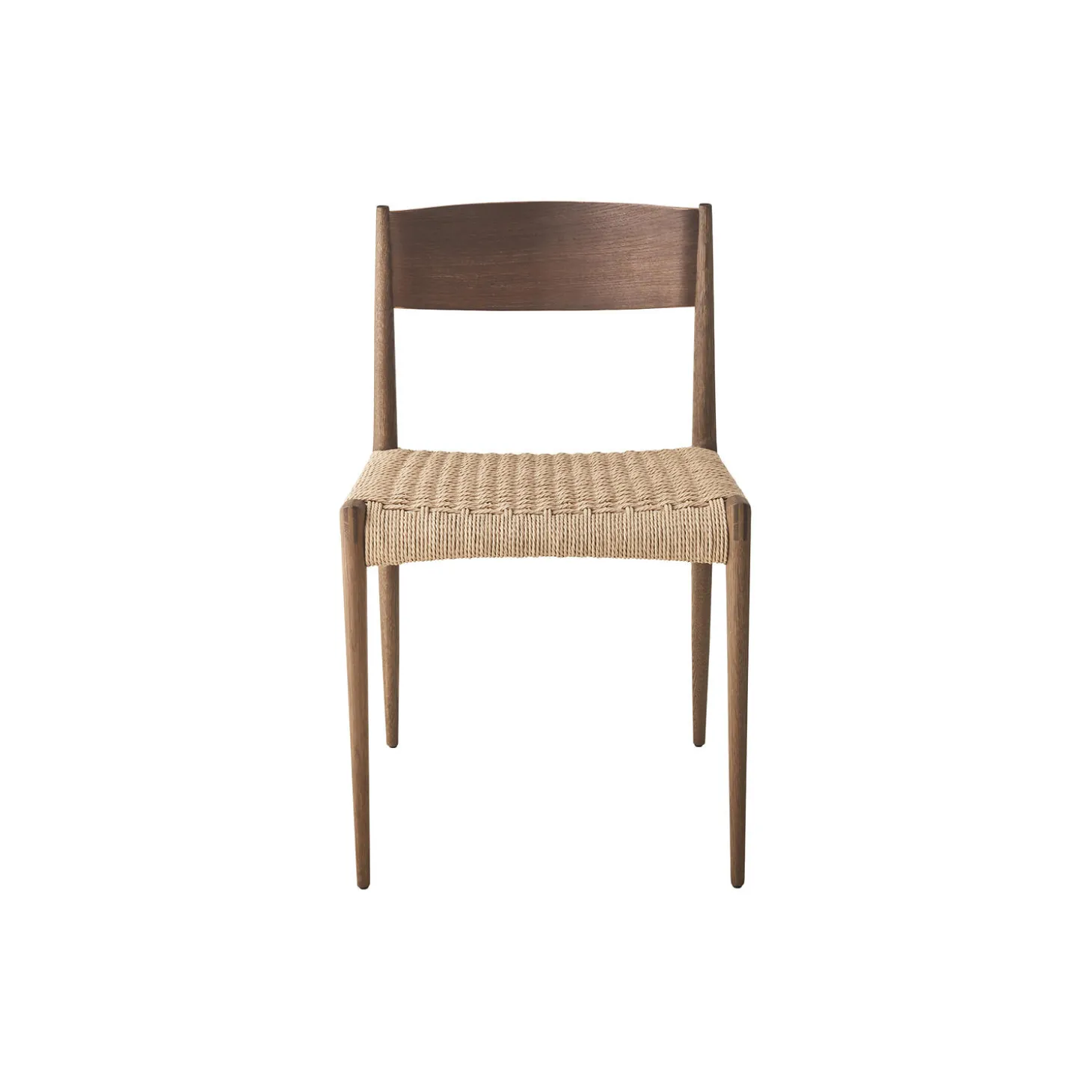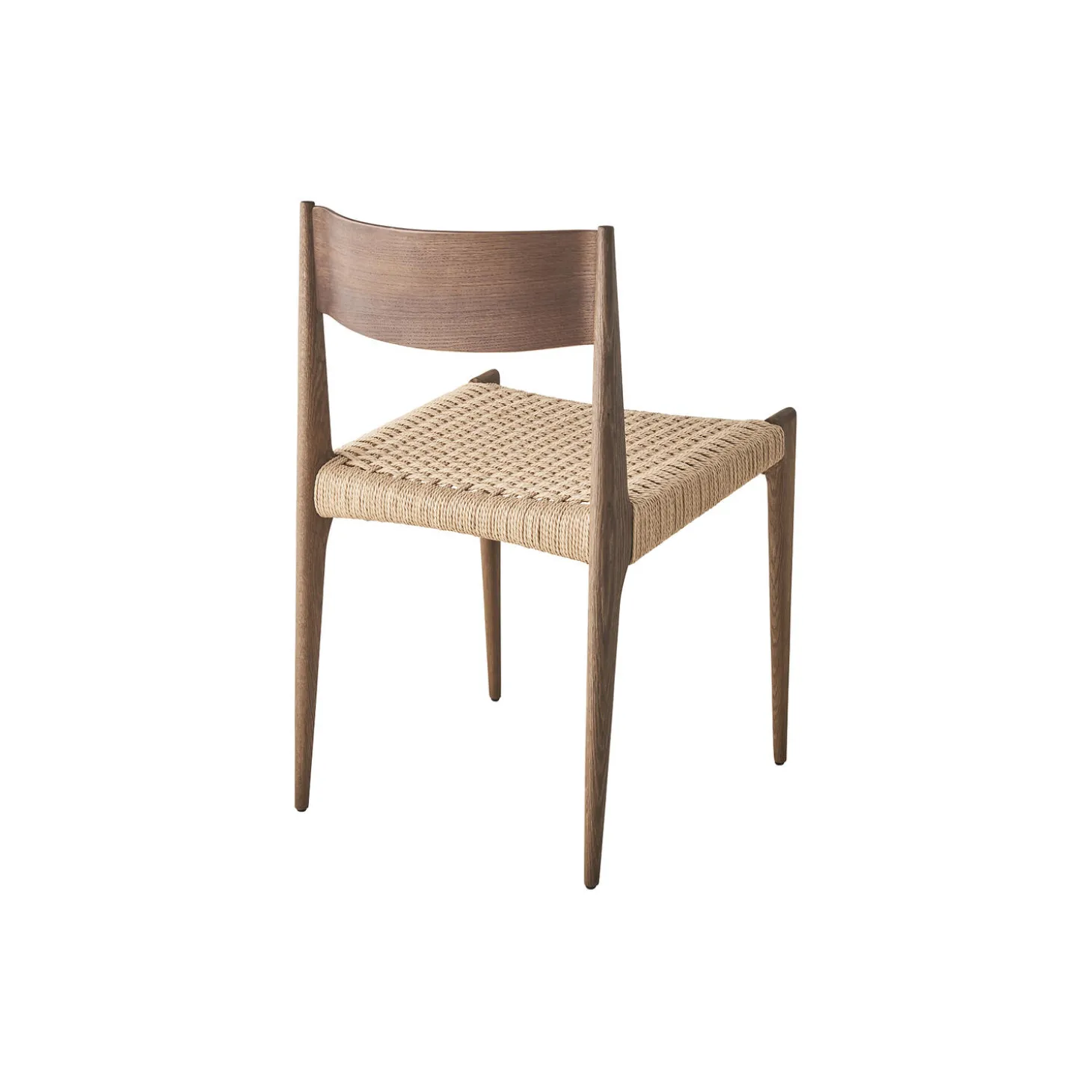 Pia spisebordsstol i røget eg med sæde i papirgarn fra DK3. Farve: røget eg/natur. Mål: H: 75 x B: 48 x D: 49 cm. Siddehøjde: 45 cm. Design: Poul Cadovius.