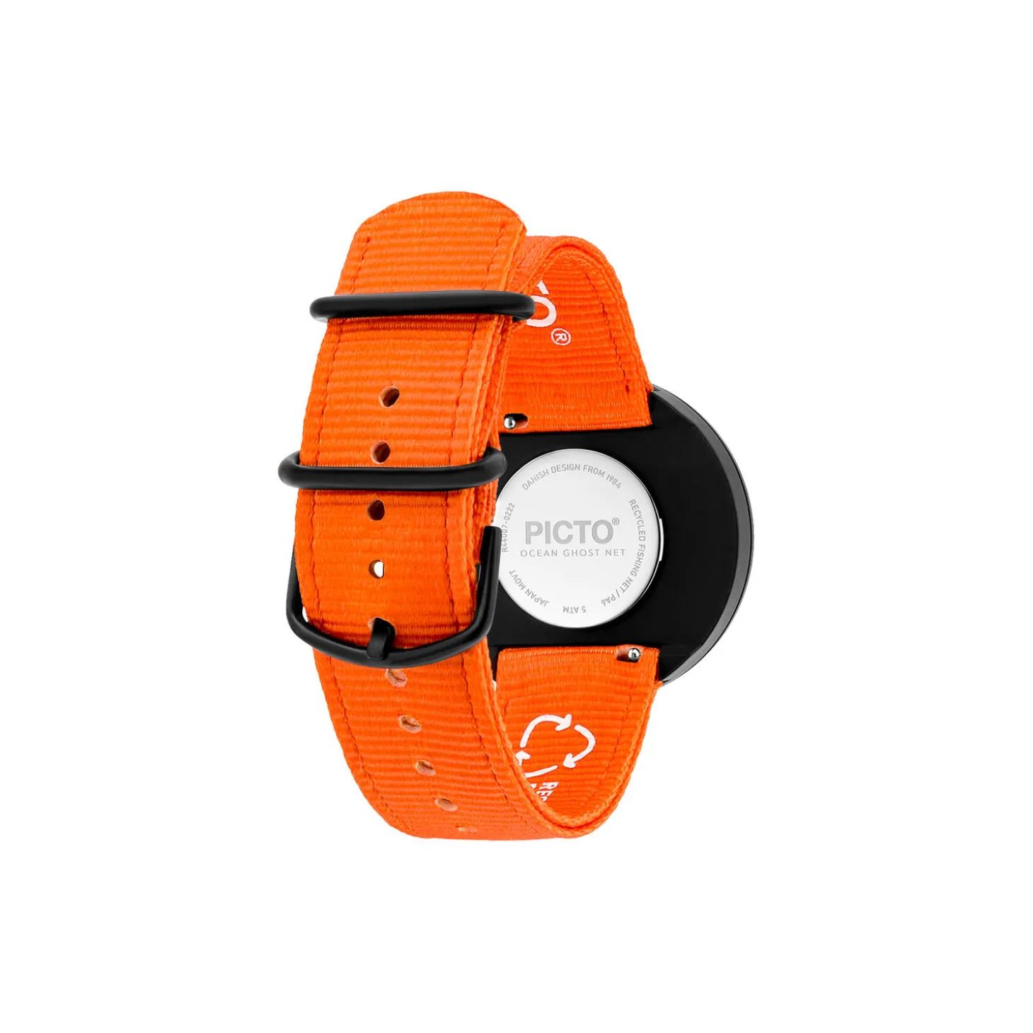 PICTO wrist watch with a rotating dial and signal orange recycled plastic strap. The dial on this watch is 40 mm.