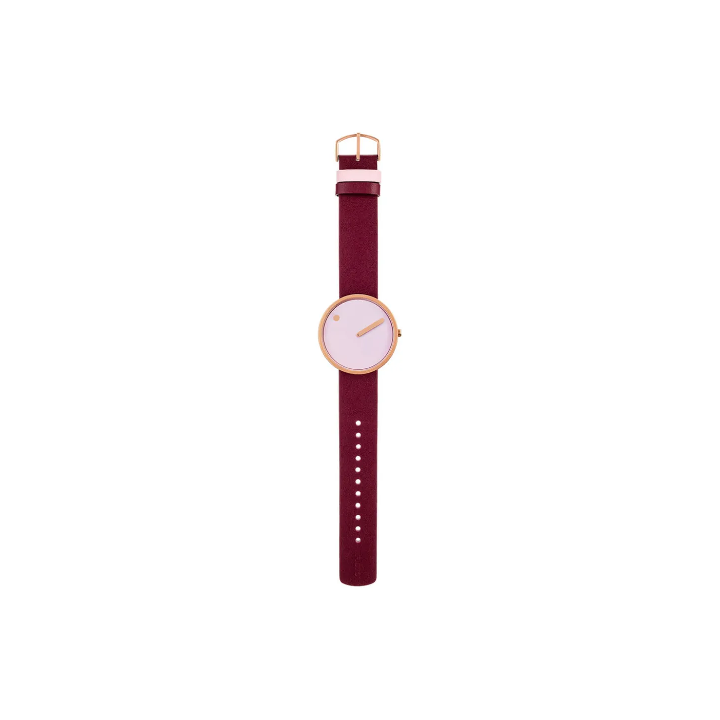 Urets diameter: 40 mm. Skivefarve: dusty rose pink. Urkassefarve: matt rose gold. Remtype: leather strap. Rembredde: 20 mm. Remfarve: burgundy red. Urværk: MIYOTA 2025.