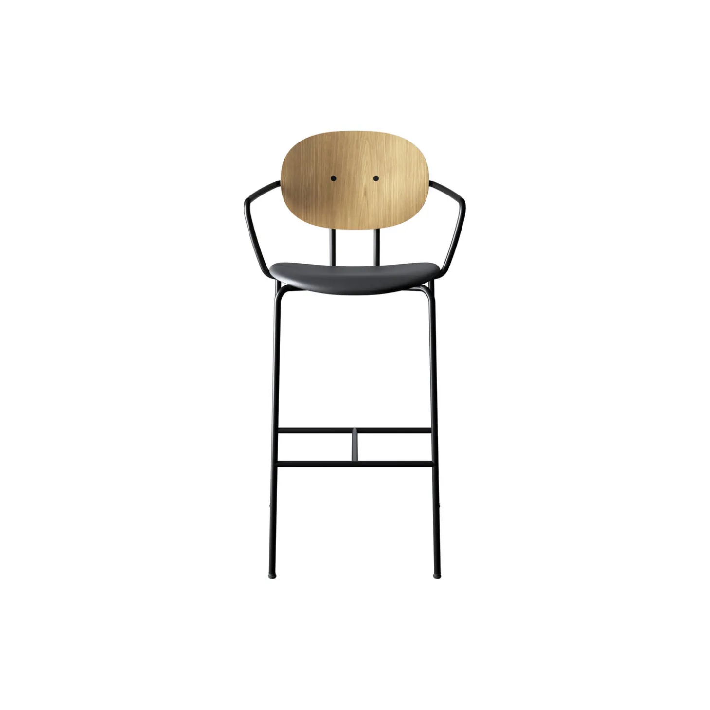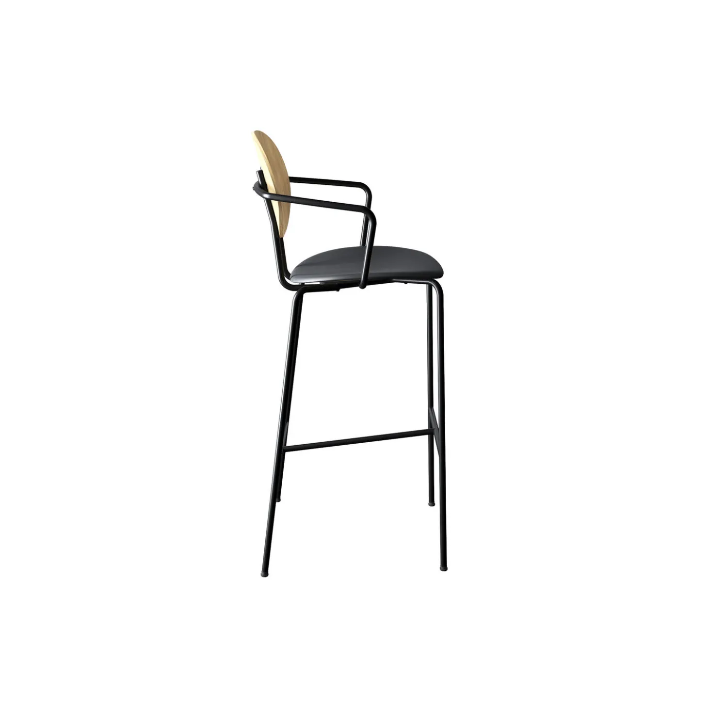 PIET HEIN Bar Chair with Arms i hvidpigmenteret egetræsfinér, sæde i Solid Black 509 og stel i pulverlakeret stål fra Sibast Furniture. Farve: hvidpigmenteret eg//Solid Black 509. Mål: H: 108 x B: 55 cm. Siddehøjde: 75 cm. Design: Piet Hein.