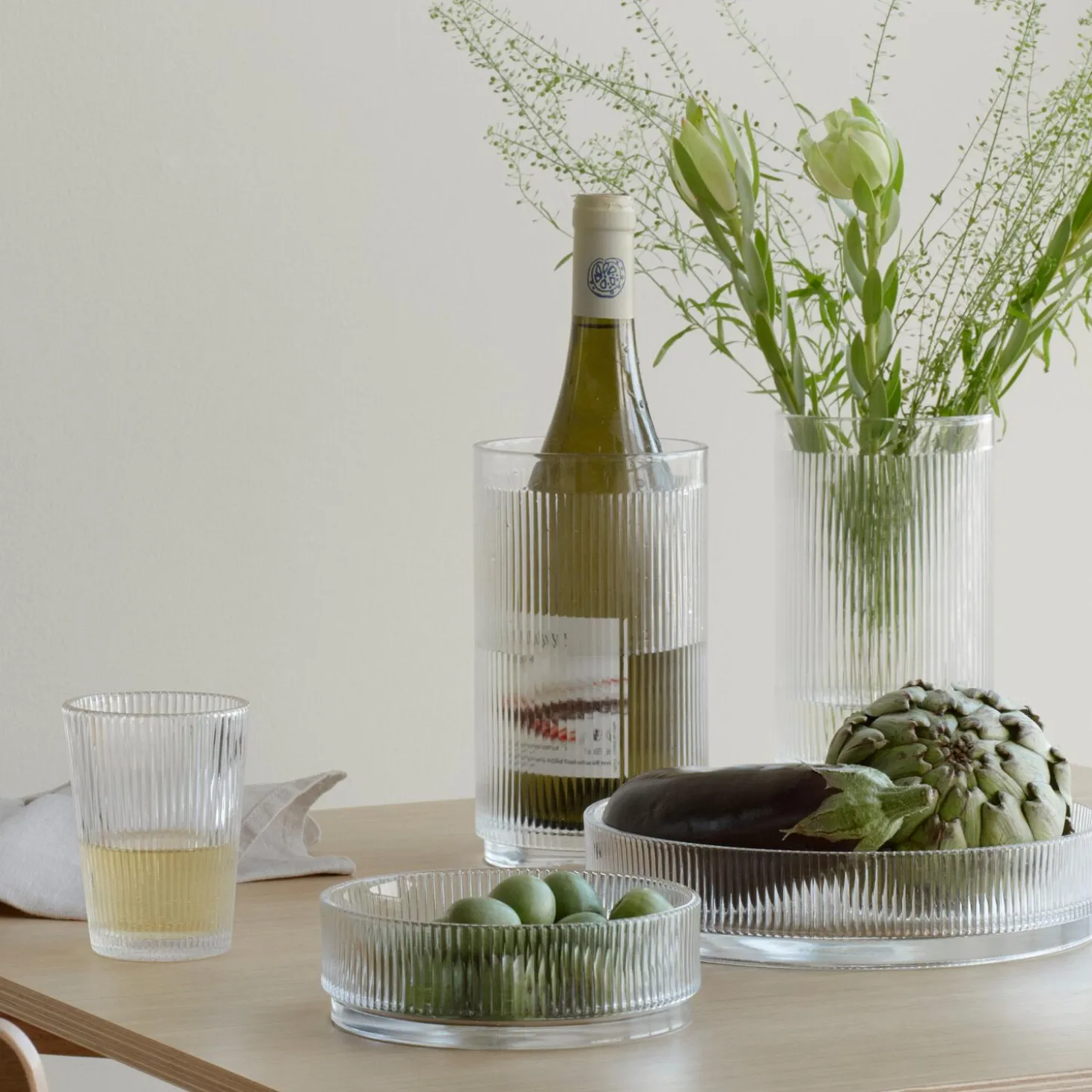 Et køligt glas vin på en varm dag. En salat serveret i en smuk glasskål. Det er de små ting, der kan gøre hverdagen til en fest. Pilastro-serien i riflet glas kan løfte et måltid fra hverdag til restaurantniveau. Designer Francis Cayouette står bag formsproget, der taler ind i de fleste moderne boligers indretning, og materialevalget gør, at det kan mikses med de fleste spisestel. Den lille skål passer fint til små anretninger og er dekorativ i sig selv eller som frugtfad.