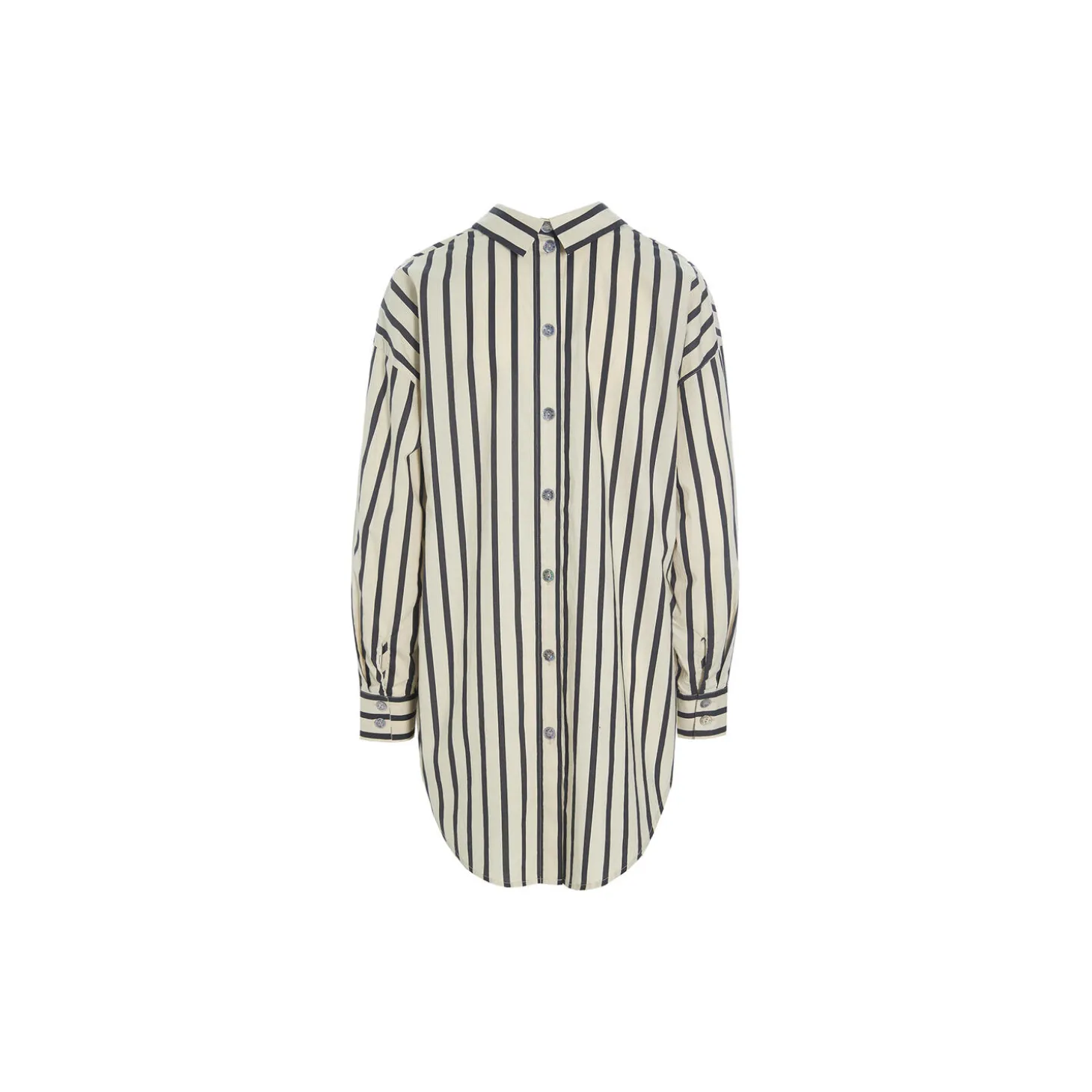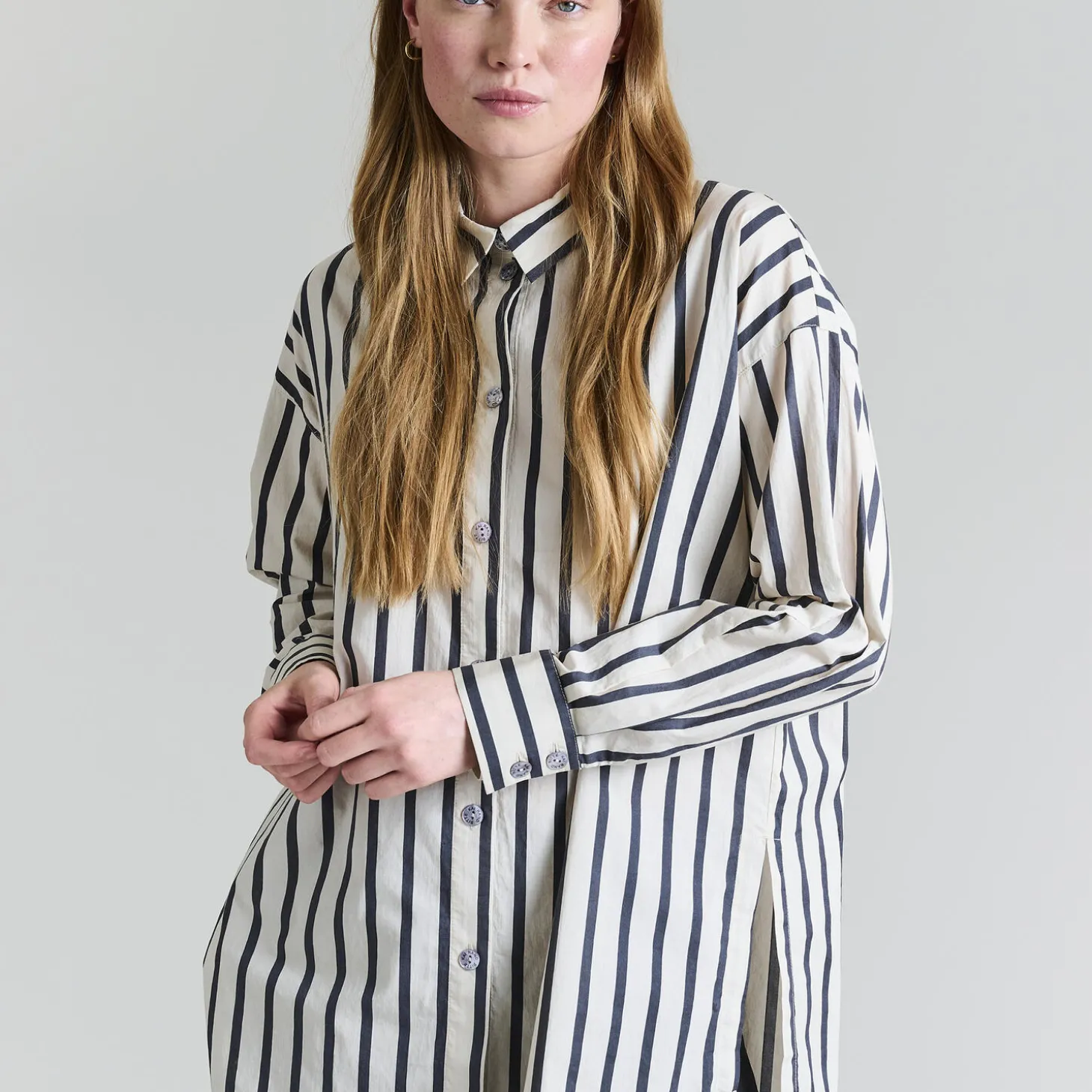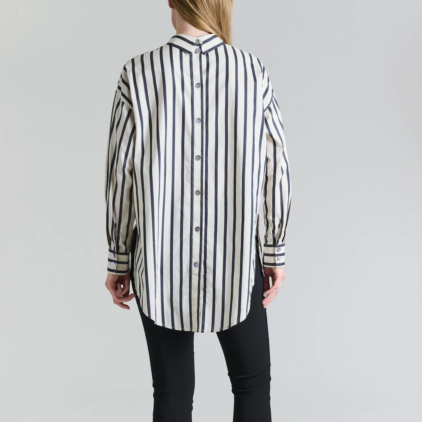 Stribet skjorte i en lækker, økologisk bomuldskvalitet. Designet er ved første øjekast helt klassisk, men på ryggen er der den finurlige detalje, at krave og knaplukning også findes her. Det gør skjorten helt speciel. En lækker skjorte, der kan kombineres med stort set alle underdele.