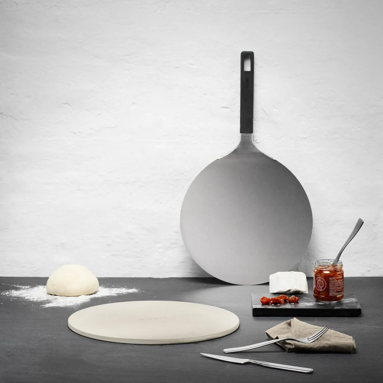 Eva Solo pizzaspade passer med en diameter på 32 cm til en standardpizza og til Eva Solo bagesten, som er lige til at lægge på grillen eller i ovnen, når brød og pizza skal bages professionelt. Pizzaspaden er i rustfrit stål, så den er nem at skubbe ind under pizzaen, og har et tilpas langt silikonegreb, som ikke bliver varmt i brug. Hullet i grebet gør, at pizzaspaden kan hænge ved siden af grillen, så den er lige ved hånden, når der er brug for den.