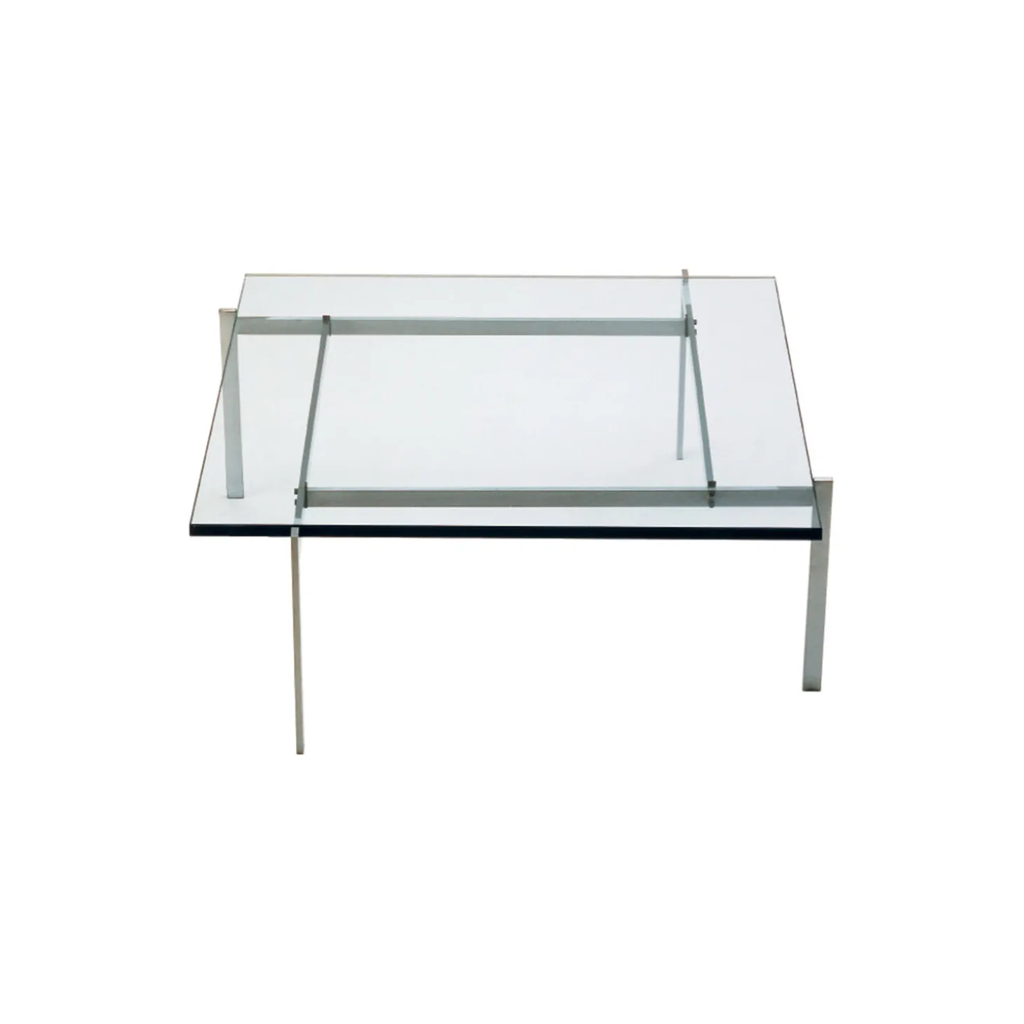 PK61™ sofabord med bordplade i glas og stel i satinbørstet rustfrit stål fra Fritz Hansen. Farve: klar. Mål: H: 32 x L: 80 x B: 80 cm. Design: Poul Kjærholm.