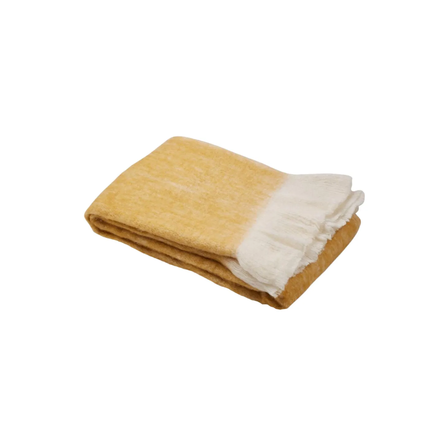 Plaid i 65% akryl, 25% polyester og 10% mohairuld fra NATURES Collection. Farve: mustard. Mål: 130×170 cm.