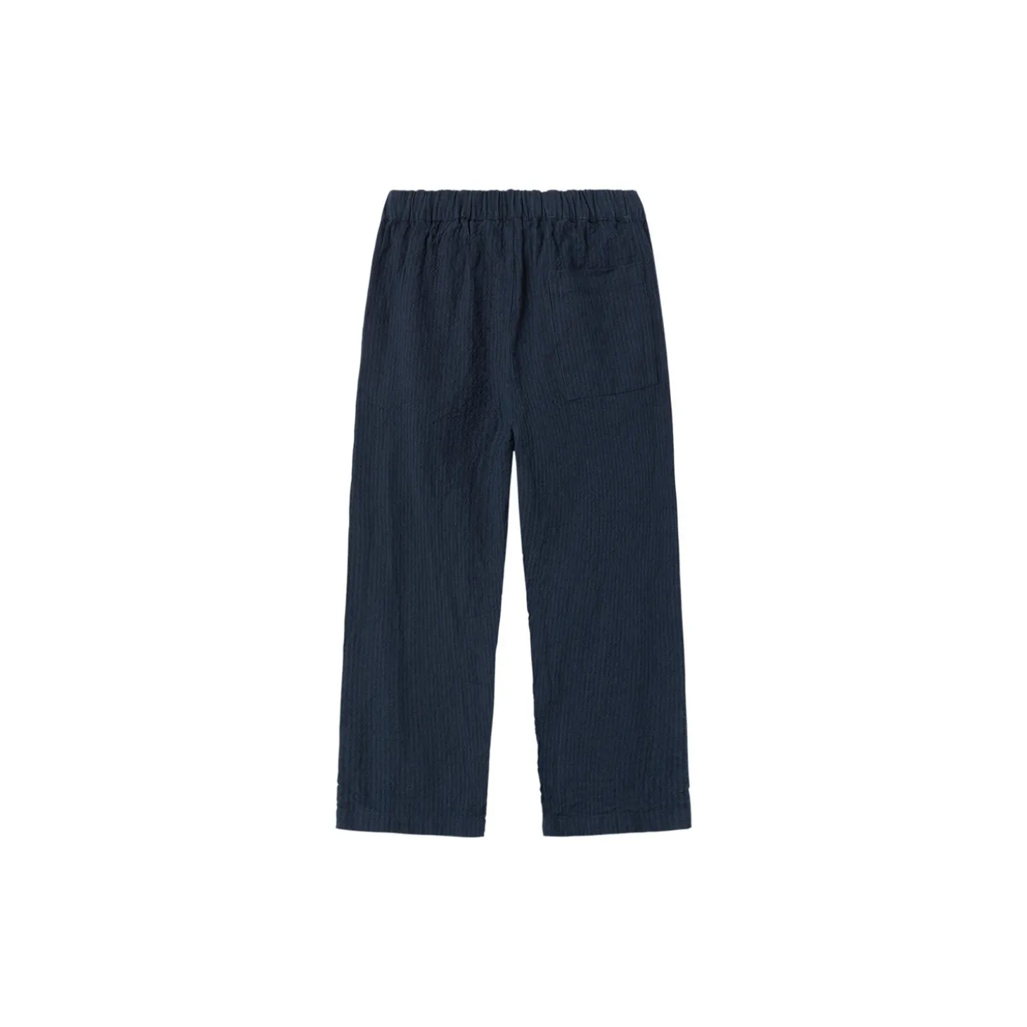 Bukser med en løs pasform og med en lomme bagpå samt elastik og bindebånd i taljen.