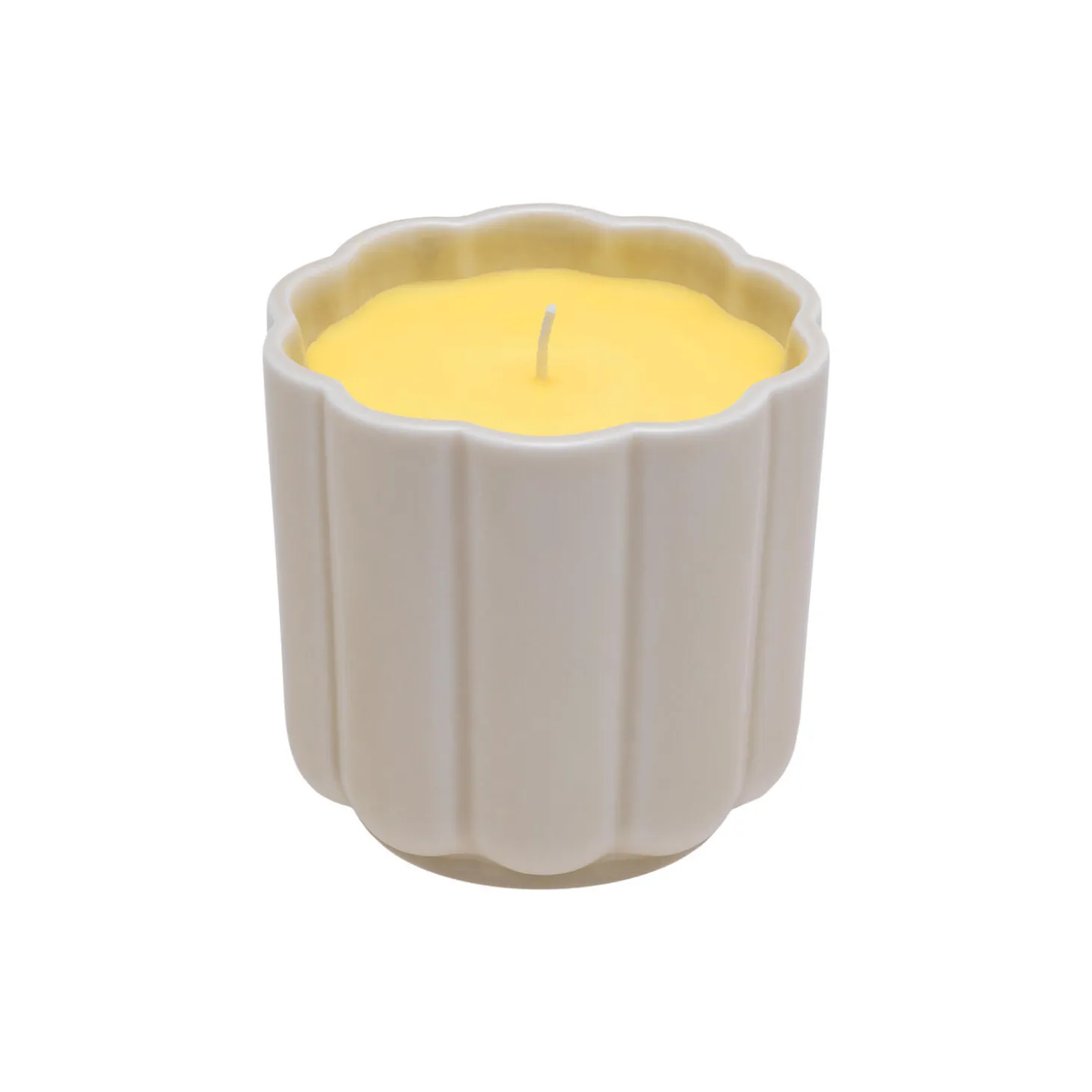 Et legende lys er en velkommen tilføjelse til enhver boligindretning og den perfekte gave. Play candle er et gult sojavokslys i en rund beige porcelænskop. Da koppen er af porcelæn, er den også alsidig. Når du har brændt lyset, kan du bruge den som en dekorativ skål. Vask koppen omhyggeligt, når lyset er brændt ud. Play er en samling af ting til hjemmet, som er nemme at mikse og matche. Det er funktionelle ting, man kan lege med i borddækningen og indretningen. De varme farver, der gløder i solen, og Matisses udklipskunst har inspireret til kollektionen. Kollektionen fokuserer på kunsthåndværk, materialeudtryk, dristige farvekombinationer og et legende miks af former.