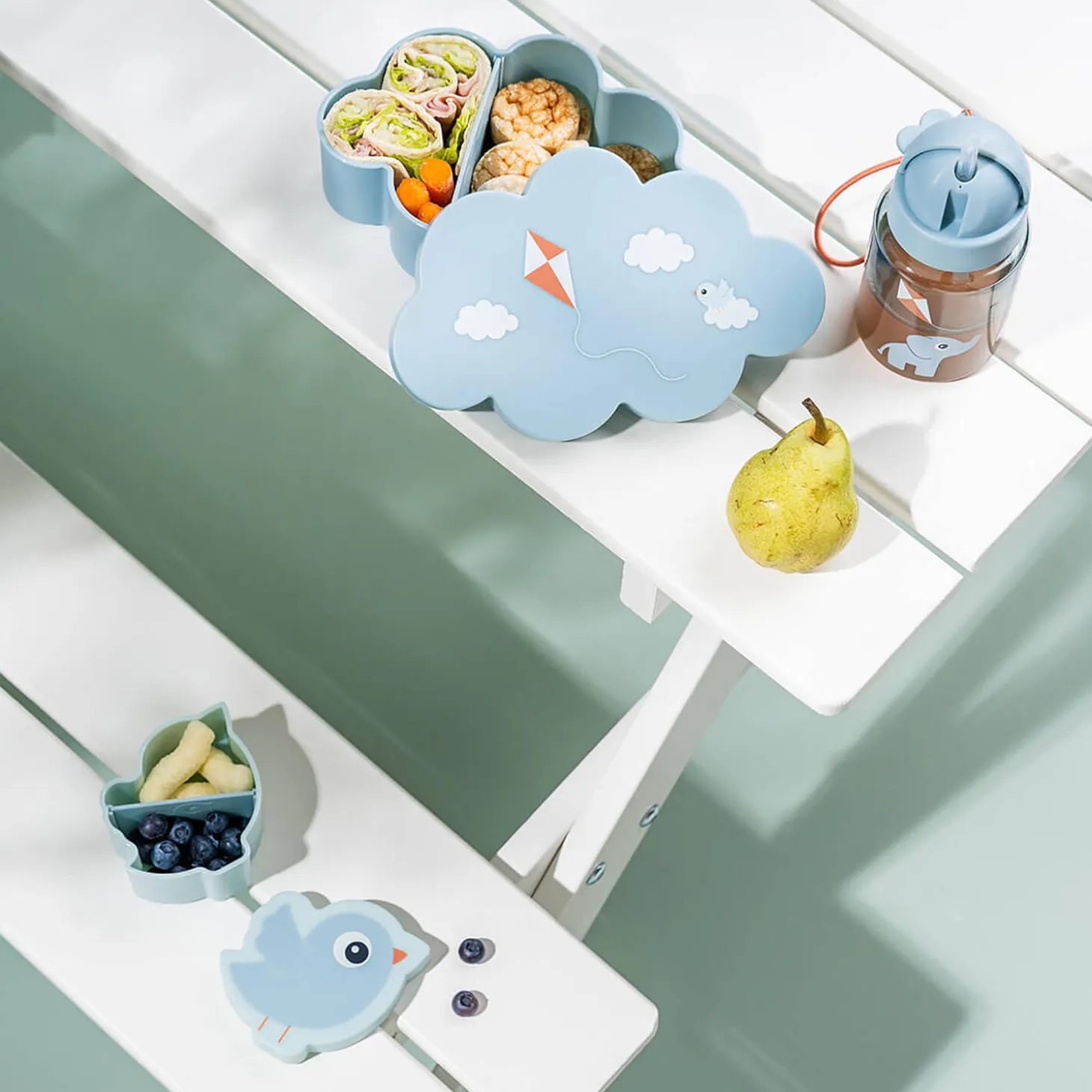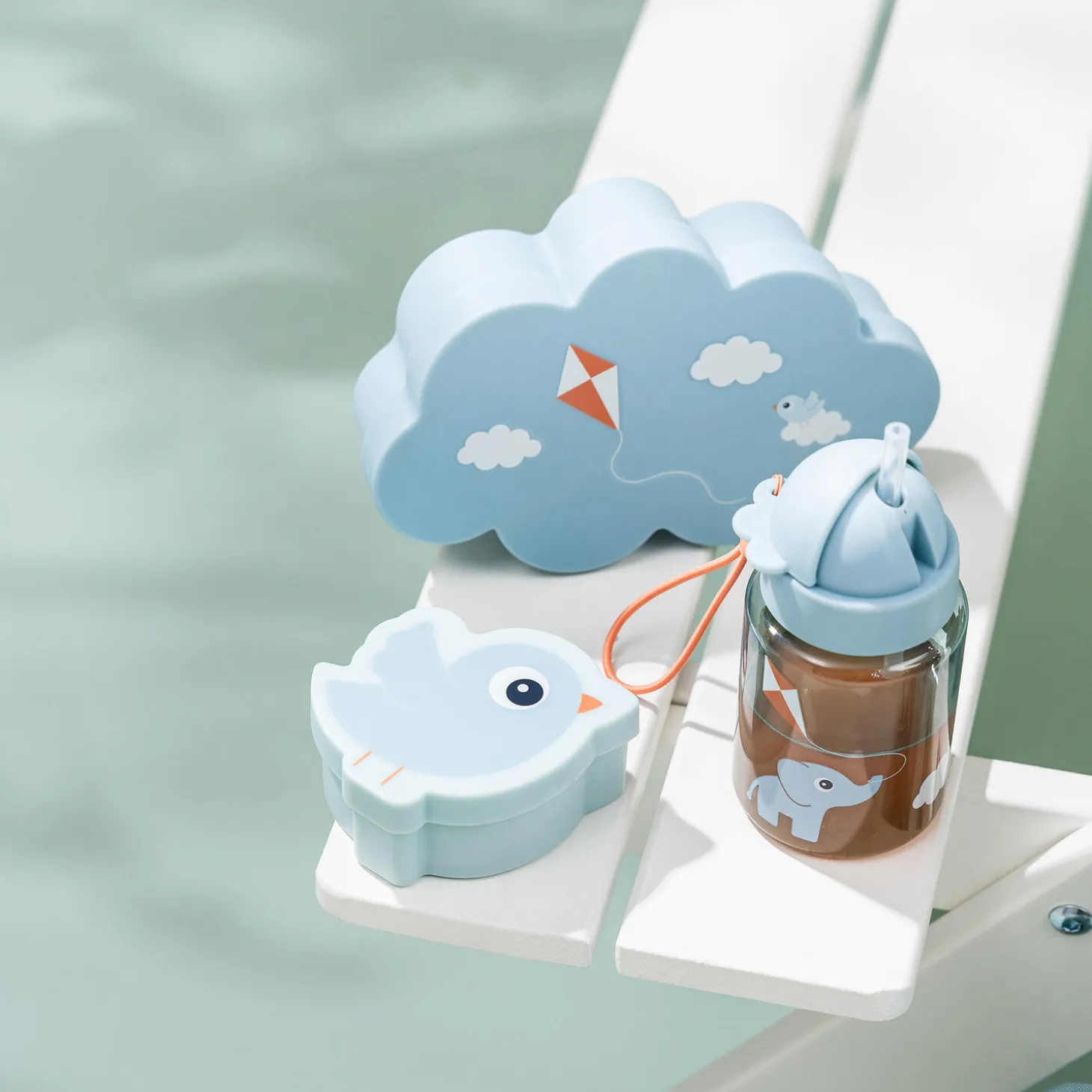 • Blåt sæt der indeholder drikkedunk med sugerør, snackboks og madkasse• Den gennemsigtige, blå flaske har et praktisk sugerør, der kan foldes ind og forhindrer væske i at løbe ud• Krokodilletakkerne på flaskens låg gør det let for barnet at åbne til sugerøret• Snackboksen og madkassen har en praktisk indsats, der gør det muligt at dele madkassen op i to rum• Sødt motiv af Birdee og Elphee, der flyver med drage• Perfekt til daginstitution, skole eller eventyr i det fri