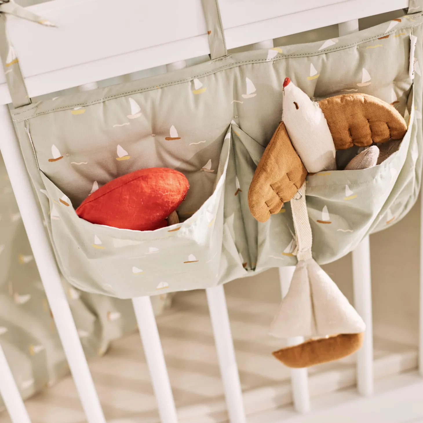 Vores skønne quiltede sengelomme er dekorativ og praktisk til opbevaring af yndlingsbamsen, den lille bog eller sutterne. Fastgøres nemt til sengen med fine bindebånd.