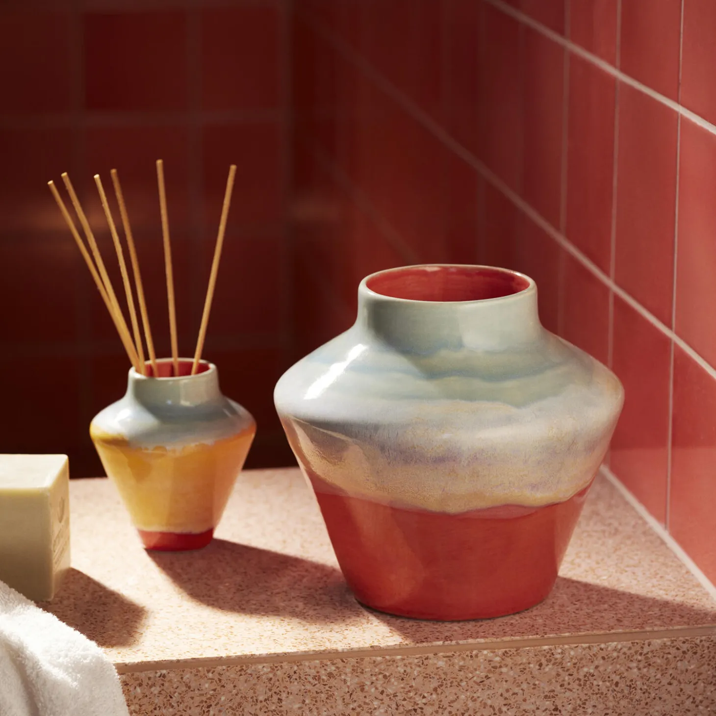 Farverig popkultur møder håndlavede designtraditioner i samarbejdet mellem Kähler og designduoen KIMPOP, der tæller tv-personlighederne Sofie Linde og Joakim Ingversen. I en årrække har duoen med stor passion udforsket keramikkens verden, og deres viden om glasurer, brænding og det keramiske håndværk forener de med deres kærlighed til pop og populærkultur med udgangspunkt i de sene 80’ere og tidligere 90’ere, som de selv er rundet af. Og resultatet? Kollektionen Pottery, der er lige så farverigt som Sofie og Joakim. KIMPOP ønsker at udfordre danskernes brug af farver i boligen, bryde med de traditionelle skandinaviske farvetraditioner og invitere os til at tage flere farverige chancer i indretningen. Den nye kollektion fra Kähler X KIMPOP er et selvsikkert mix af pasteller, opulente glasurer, humoristiske detaljer og former, der vil frem i verden. Vasen på 20,5 cm domineres af rosa og røde nuancer. De levende glasurer flyder smukt sammen og finder deres egen vej ned langs overfladen, hvilket er med til at forstærke det autentiske, håndmalede udtryk. Med sit iøjefaldende design fungerer vasen som et statement piece og vil øjeblikkeligt tilføje et farverigt og legende element til indretning og et boost af livsglæde – uden at du behøver at male gulve, vægge og køkkenlåger lyserøde, selvom du selvfølgelig også er velkommen til det!