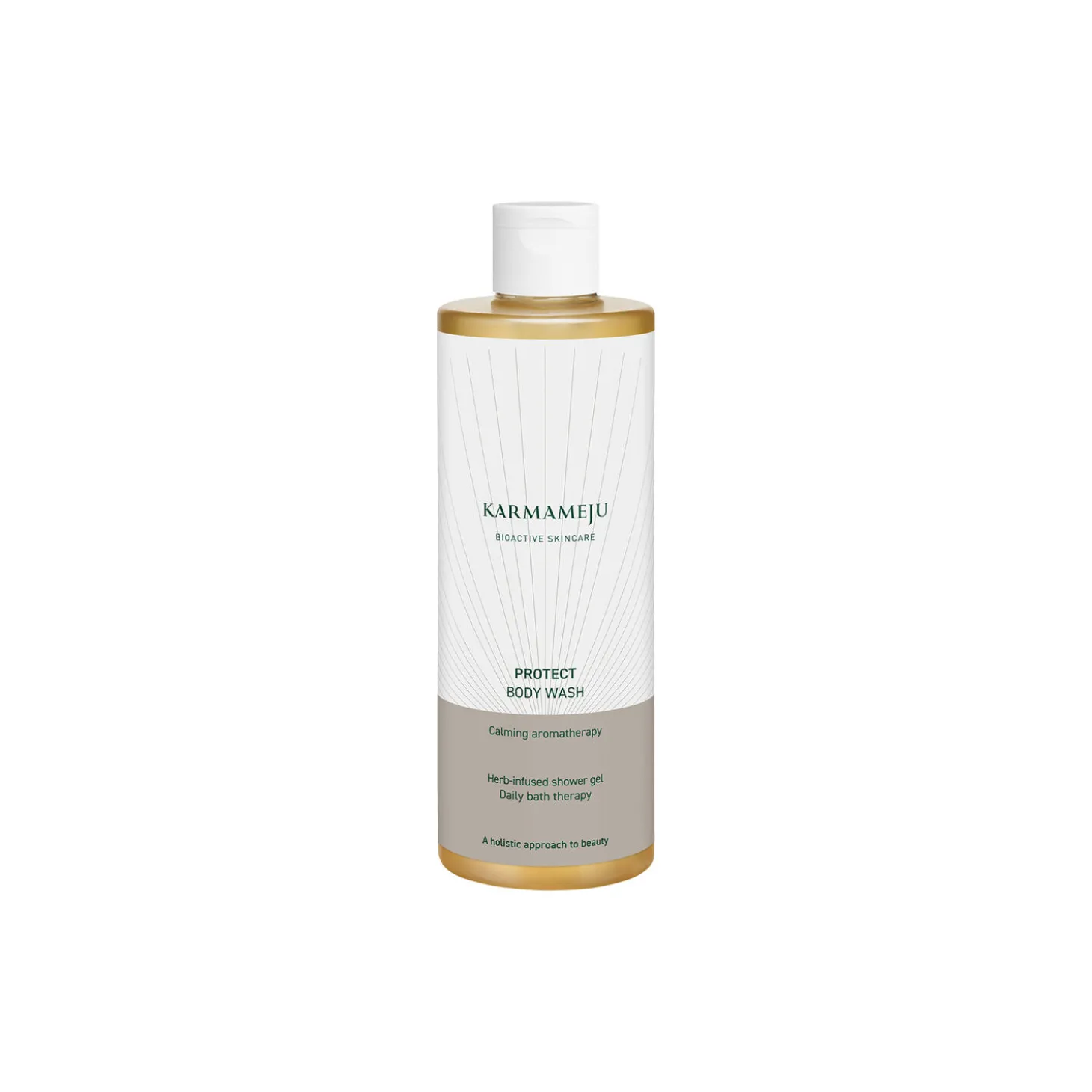 Protect Body Wash 02 fra Karmameju. Naturligt skummende, sulfatfri sæbe til kroppen, der plejer og renser huden. Med duft af “den europæiske urtehave”. Indeholder: 400 ml.