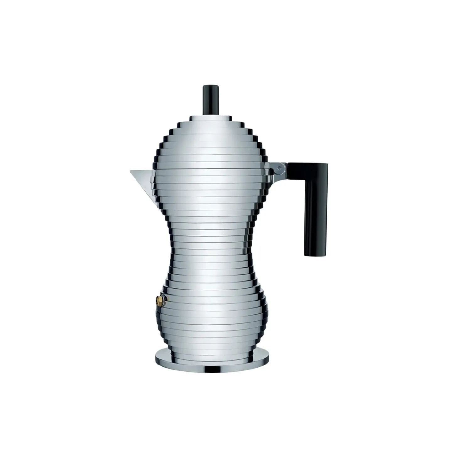 Pulcina espressokande i støbt aluminium og nylon fra Alessi. Farve: stål/sort. H: 26 x Ø 7,5-12 cm. Indeholder: 30 cl. 6 kopper. Design: Michele De Lucchi. Ikke egnet til induktion.