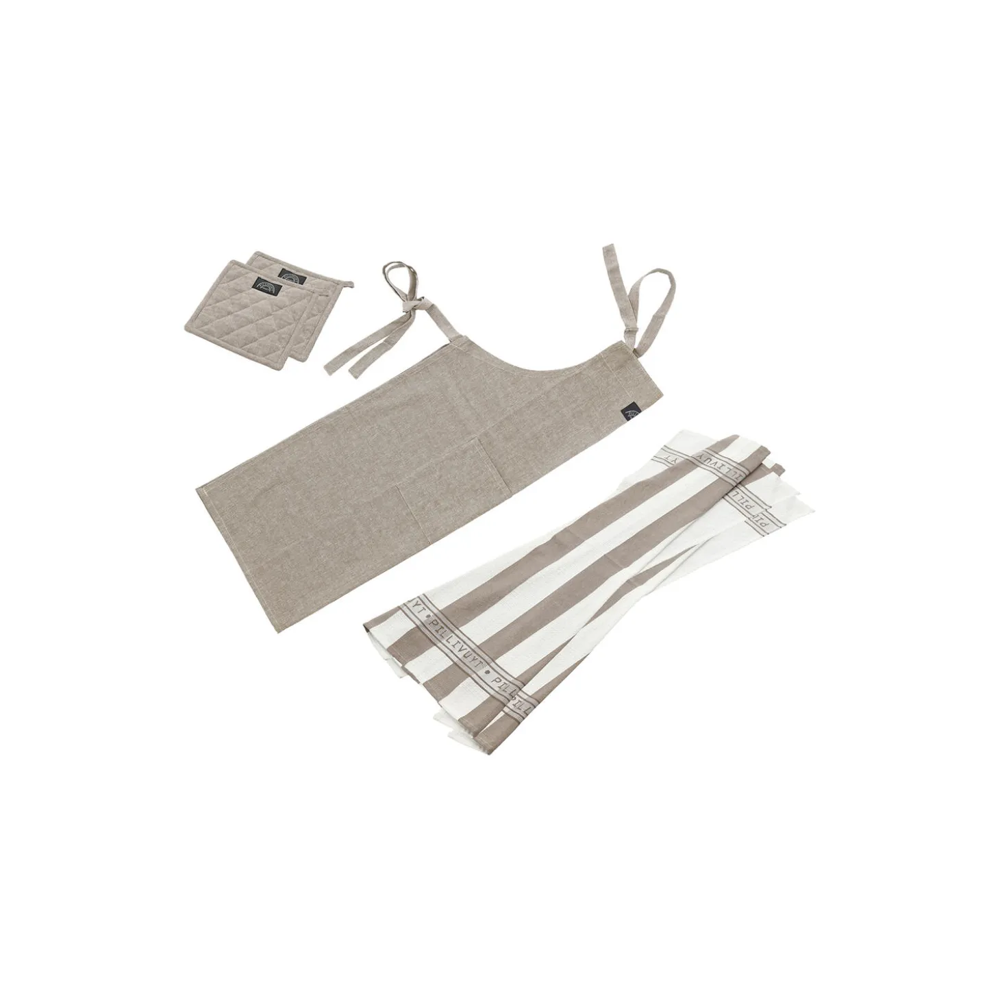 Tekstilsættet består af forklæde 95 x 80 cm, 2 viskestykker 45 x 70 cm og 2 grydelapper 22,5 x 22,5 cm i bomuld/polyester. Tekstilerne er fremstillet af genanvendte stofrester, der ellers ville være blevet kasseret. Stofresterne sorteres efter farve, trevles til tekstilfibre og bliver derefter spundet og vævet igen. Derfor kan der være nuanceforskelle fra parti til parti.