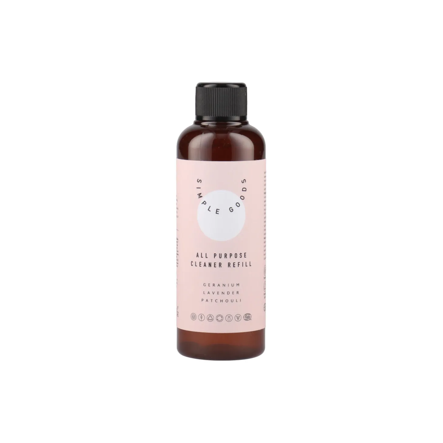 Refill All Purpose Cleaner fra Simple Goods. Duft: geranium, lavendel, patchouli. Refill til den tomme All Purpose flaske – Nok til at mixe 2 stk 500 ml flasker. Hæld halvdelen af refill flasken i din tomme All Purpose Cleaner flaske. Fyld op med lunkent vand, skru sprayeren på flasken og ryst grundigt. Din All Purpose Cleaner er nu klar til brug.