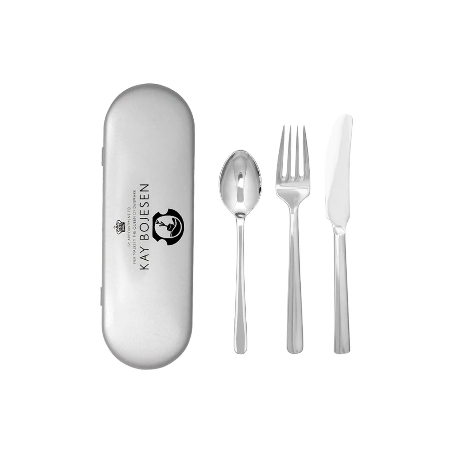 Kay Bojesens rejsebestik er en lille praktisk æske. Velegnet til at putte i tasken, lommen eller rygsækken. På den måde har du altid dit yndlingsbestik ved hånden, når et måltid skal indtages på farten eller på jobbet. Rejsesættet indeholder Kay Bojesens frokostkniv og gaffel samt den lille dessertske, som måler hhv 18, 17 og 15 cm. Bestikket ligger i en praktisk metalæske, som er let at rengøre imellem brug.