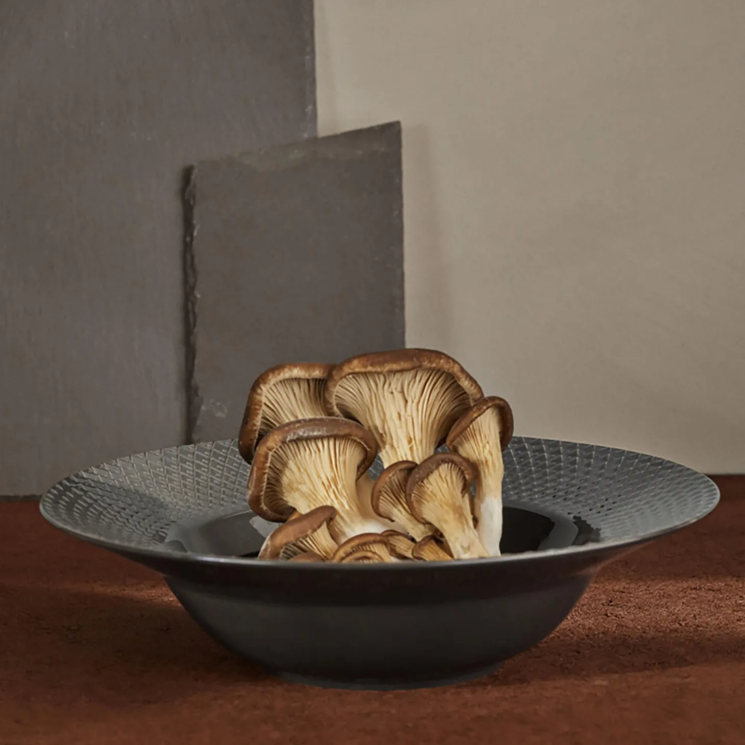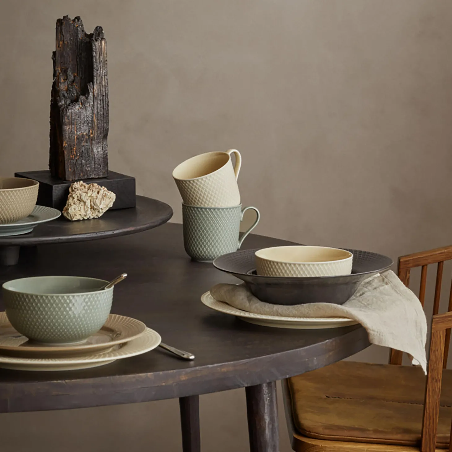 Et jordnært og nærværende udtryk på bordet. Med en farvepalet i fire elegante jordfarver inviterer Rhombe Earth os til at sætte farten ned, være nærværende omkring det vi spiser, dem vi spiser med og at lægge mærke til skønheden i det stel, vi spiser af. Seriens pastatallerken på 24,5 cm i diameter, der også er perfekt til suppe, kommer i den mørkegrå farve slate, der ligesom de andre afdæmpede jordfarver i Rhombe Earth bringer Rhombe-stellets ikoniske reliefmønster frem på en ny og anderledes måde og indbyder til, at vi går et lag dybere og giver opmærksomhed til maden på tallerkenen, til sanserne og til samtalen med de andre omkring bordet. Alle Rhombe Earth-seriens fire smukke farver – slate, marble, clay og moss – er ligesom i Lyngby Porcelæns populære Rhombe Color-serie nøje udvalgt af designduoen Stilleben, der består af Ditte Reckweg og Jelena Schou Nordentoft. Brug alle de forskellige Rhombe Earth-dele sammen i din borddækning og lad de forskellige størrelser tallerkener titte frem under hinanden, så de lune farver får lov at tale sammen. Tallerkenerne, krusene og skålene i Rhombe Earth er selvfølgelig også både sammen og hver for sig oplagte som supplement til din Rhombe Color-samling eller i kombination med det klassiske hvide Rhombe-stel, hvor de grå og brune nuancer på de enkelte Rhombe Earth-dele sammen med Lyngby Porcelæns linjer til perfektion vil skabe et både moderne og afslappet udtryk og stå smukt op imod det hvide porcelæn.