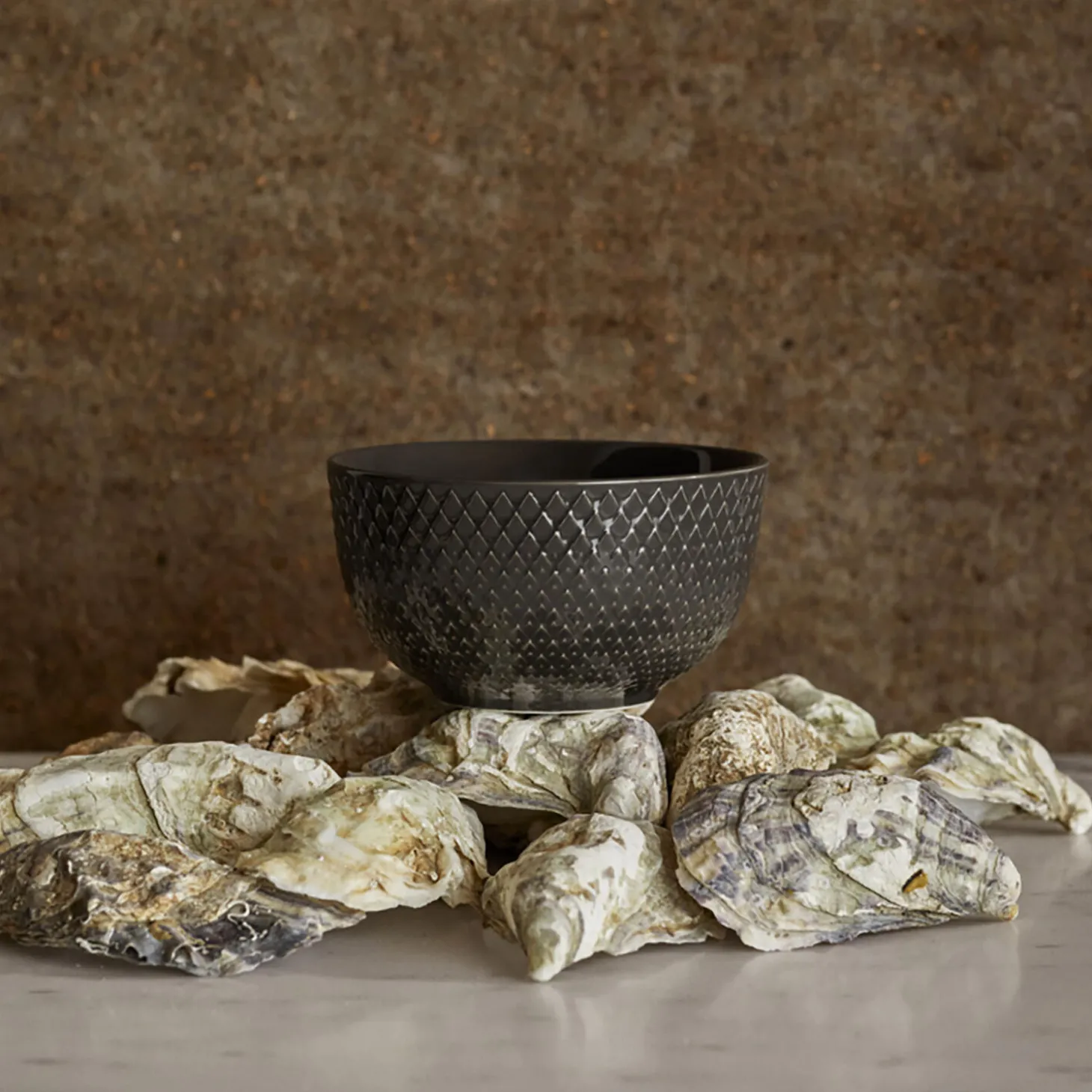 Et jordnært og nærværende udtryk på bordet. Med en farvepalet i fire elegante jordfarver inviterer Rhombe Earth os til at sætte farten ned, være nærværende omkring det vi spiser, dem vi spiser med og at lægge mærke til skønheden i det stel, vi spiser af. Seriens mindste skål på 11 cm i diameter kommer i den mørkegrå farve slate, der ligesom de andre afdæmpede jordfarver i Rhombe Earth bringer Rhombe-stellets ikoniske reliefmønster frem på en ny og anderledes måde og indbyder til, at vi går et lag dybere og giver opmærksomhed til maden i skålen, til sanserne og til samtalen med de andre omkring bordet. Alle Rhombe Earth-seriens fire smukke farver – slate, marble, clay og moss – er ligesom i Lyngby Porcelæns populære Rhombe Color-serie nøje udvalgt af designduoen Stilleben, der består af Ditte Reckweg og Jelena Schou Nordentoft. Brug alle de forskellige Rhombe Earth-dele sammen i din borddækning og lad de forskellige størrelser tallerkener titte frem under hinanden, så de lune farver får lov at tale sammen. Tallerkenerne, krusene og skålene i Rhombe Earth er selvfølgelig også både sammen og hver for sig oplagte som supplement til din Rhombe Color-samling eller i kombination med det klassiske hvide Rhombe-stel, hvor de grå og brune nuancer på de enkelte Rhombe Earth-dele sammen med Lyngby Porcelæns linjer til perfektion vil skabe et både moderne og afslappet udtryk og stå smukt op imod det hvide porcelæn.