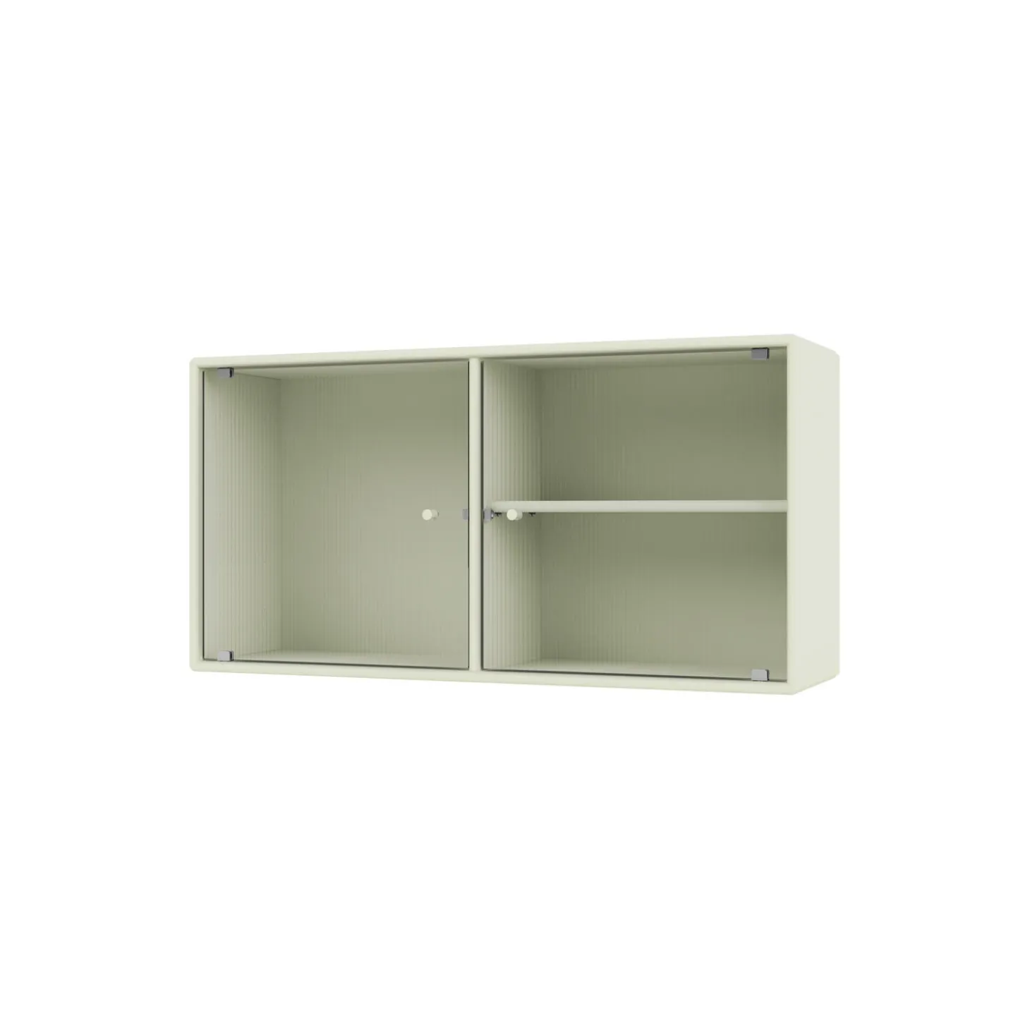 RIPPLE I er et væghængt vitrineskab med 2 låger i riflet glas. Skabet kan bruges som overskab i køkkenet, som et dekorativt skab i stuen eller spisestuen. Skabet har 1 flytbar hylde med bærere, som gør det lettere at arrangere og omarrangere hylden efter behov.