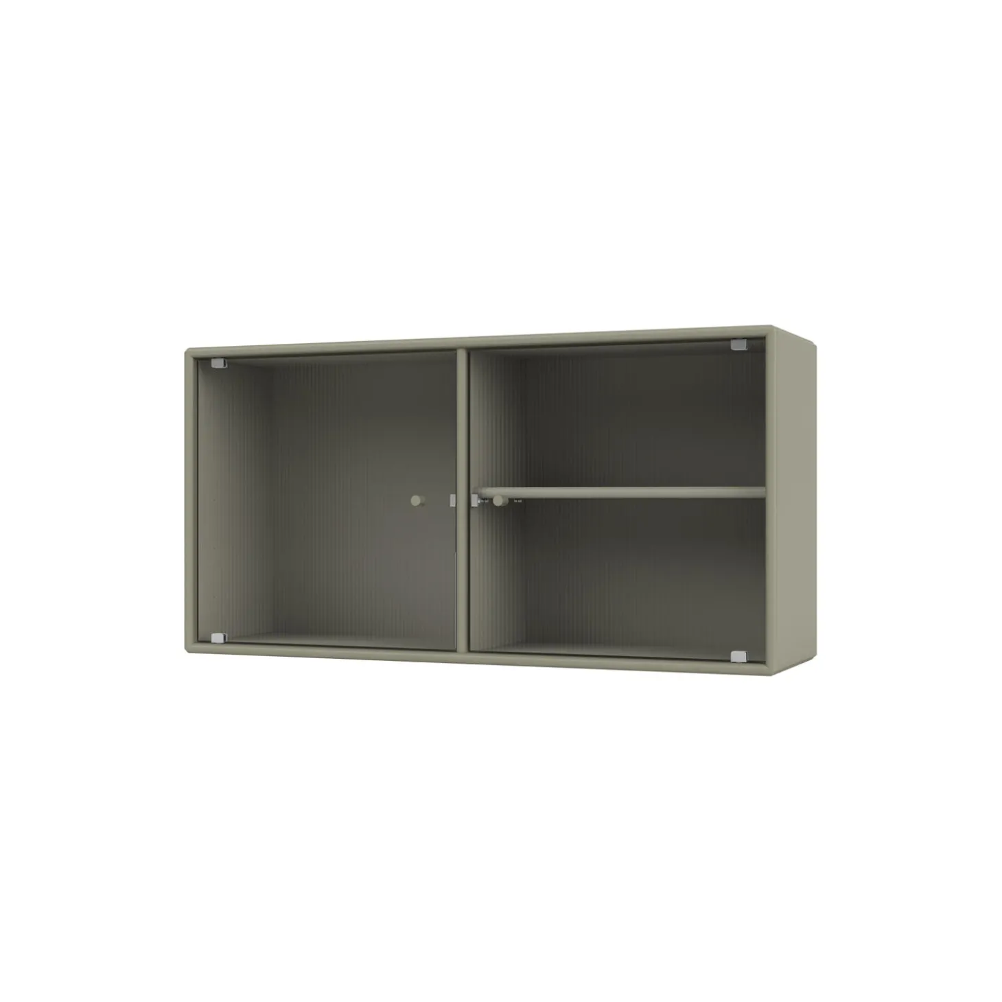 RIPPLE I er et væghængt vitrineskab med 2 låger i riflet glas. Skabet kan bruges som overskab i køkkenet, som et dekorativt skab i stuen eller spisestuen. Skabet har 1 flytbar hylde med bærere, som gør det lettere at arrangere og omarrangere hylden efter behov.