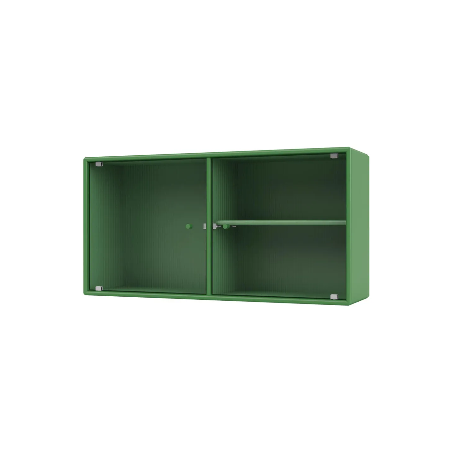 RIPPLE I er et væghængt vitrineskab med 2 låger i riflet glas. Skabet kan bruges som overskab i køkkenet, som et dekorativt skab i stuen eller spisestuen. Skabet har 1 flytbar hylde med bærere, som gør det lettere at arrangere og omarrangere hylden efter behov.