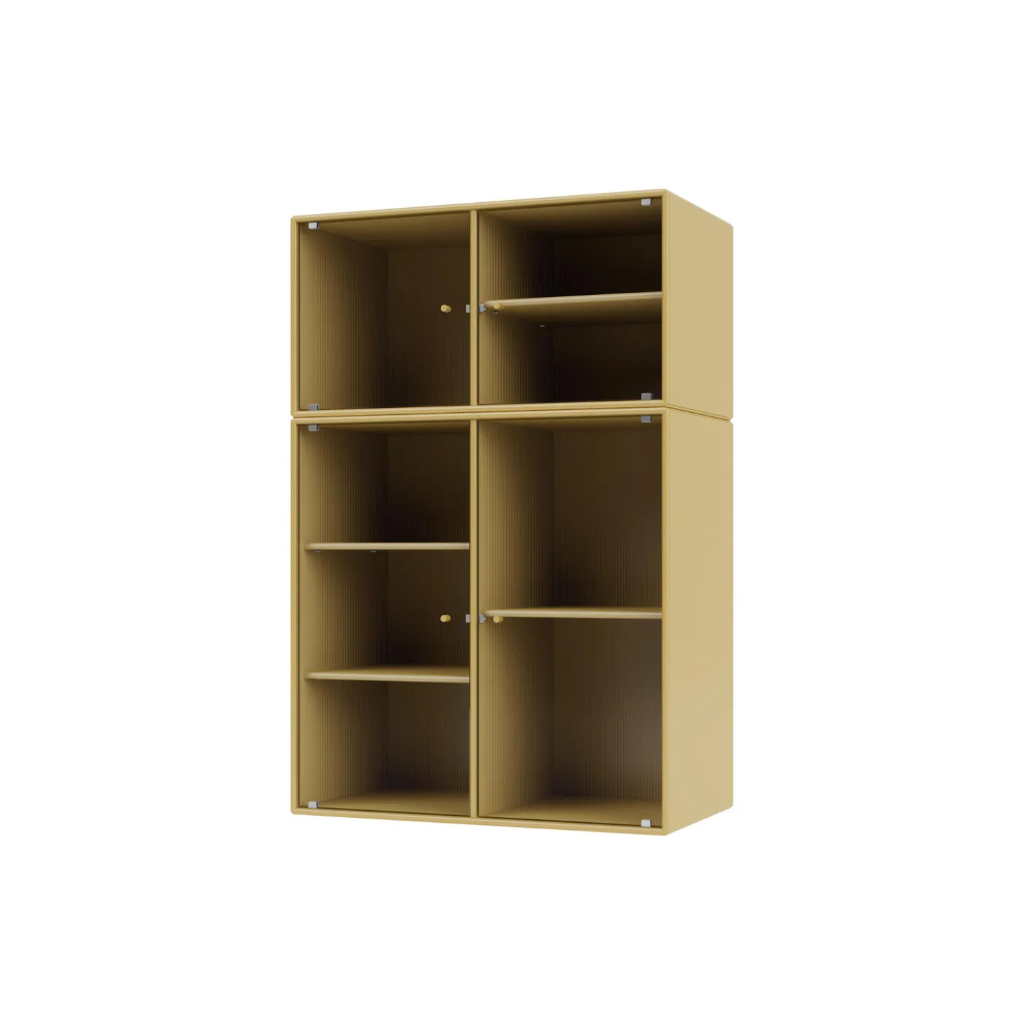 RIPPLE III er et mellemstort vitrineskab med 4 låger i riflet glas. Det fås med ben, sokkel og ophængsbeslag til montering på væg. Skabet kan bruges som skænk i stuen eller til udstilling af service i køkkenet eller spisestuen. Skabet har 4 flytbare hylder med bærere, som gør det lettere at arrangere og omarrangere hylder efter behov.