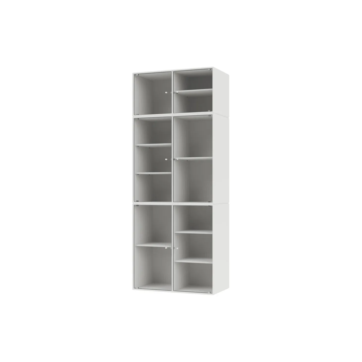 RIPPLE IV er et stort vitrineskab med 6 låger i riflet glas. Skabet er ideelt til opbevaring af service i spisestuen eller køkkenet. Det kan også rumme højere genstande som vaser. Skabet har 7 flytbare hylder med bærere, som gør det lettere at arrangere og omarrangere hylder efter behov.