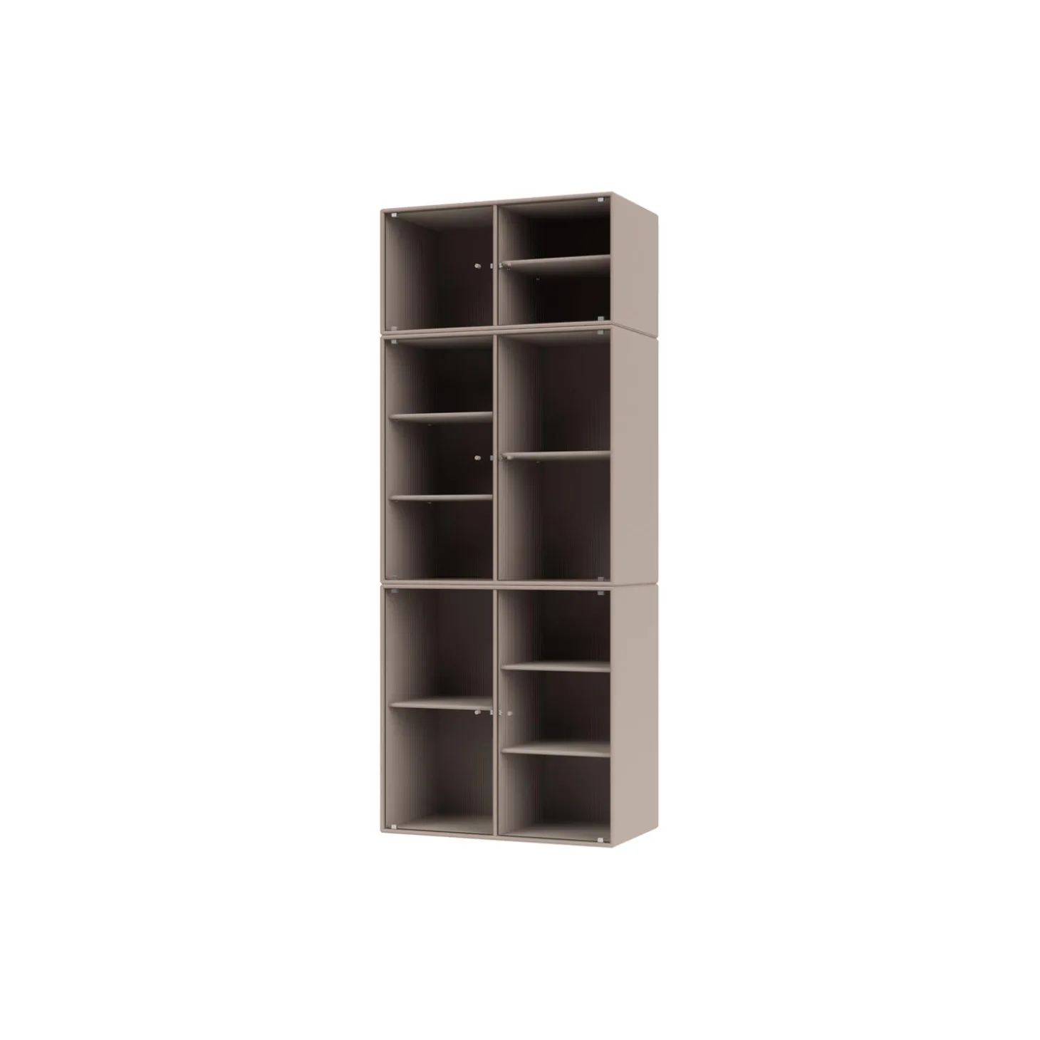 RIPPLE IV er et stort vitrineskab med 6 låger i riflet glas. Skabet er ideelt til opbevaring af service i spisestuen eller køkkenet. Det kan også rumme højere genstande som vaser. Skabet har 7 flytbare hylder med bærere, som gør det lettere at arrangere og omarrangere hylder efter behov.