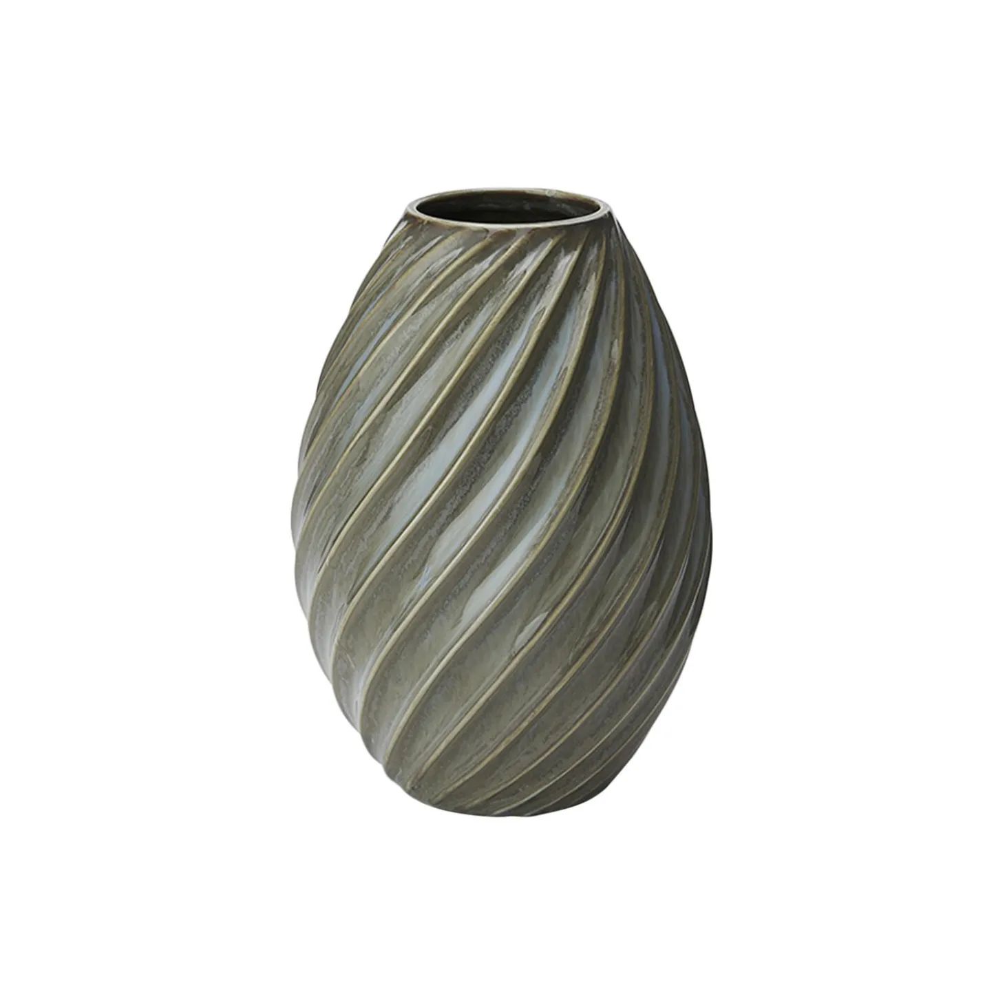 Som lette krusninger på vand snor det smukke diagonale spiralmønster sig elegant om de slanke vaser og giver dem et spændende stramt, grafisk udtryk. Udført i porcelæn og glaseret med en smuk gråblå glasur, der på flotteste vis understreger vasens form, som er tilpasset til roser, afskårne blomster fra haven og forårsgrene.