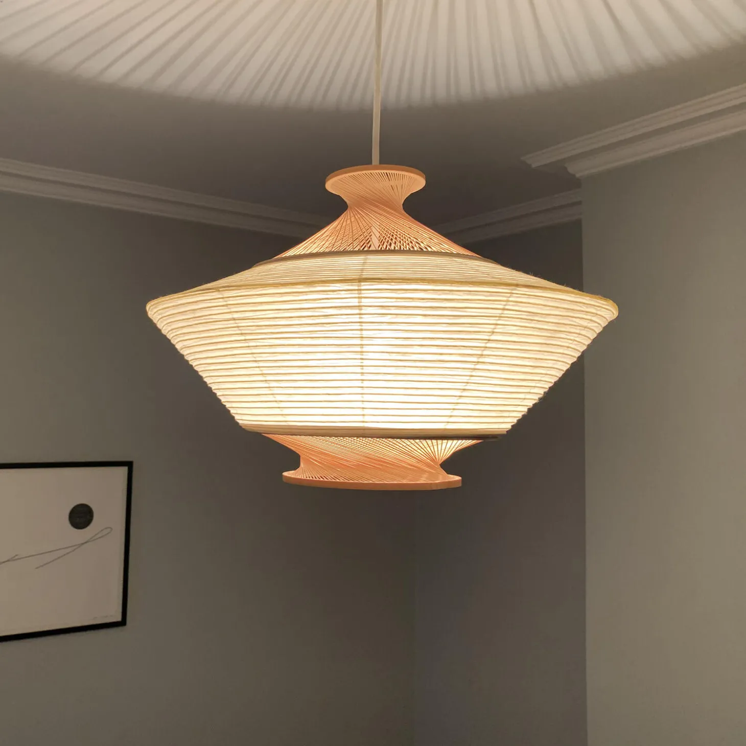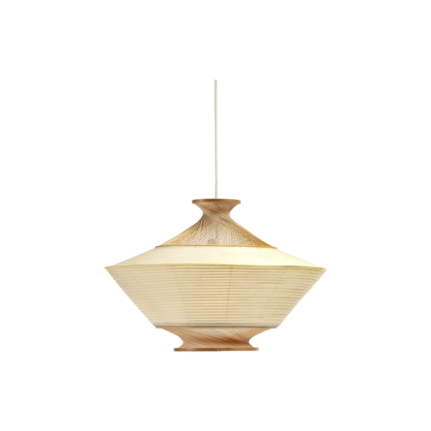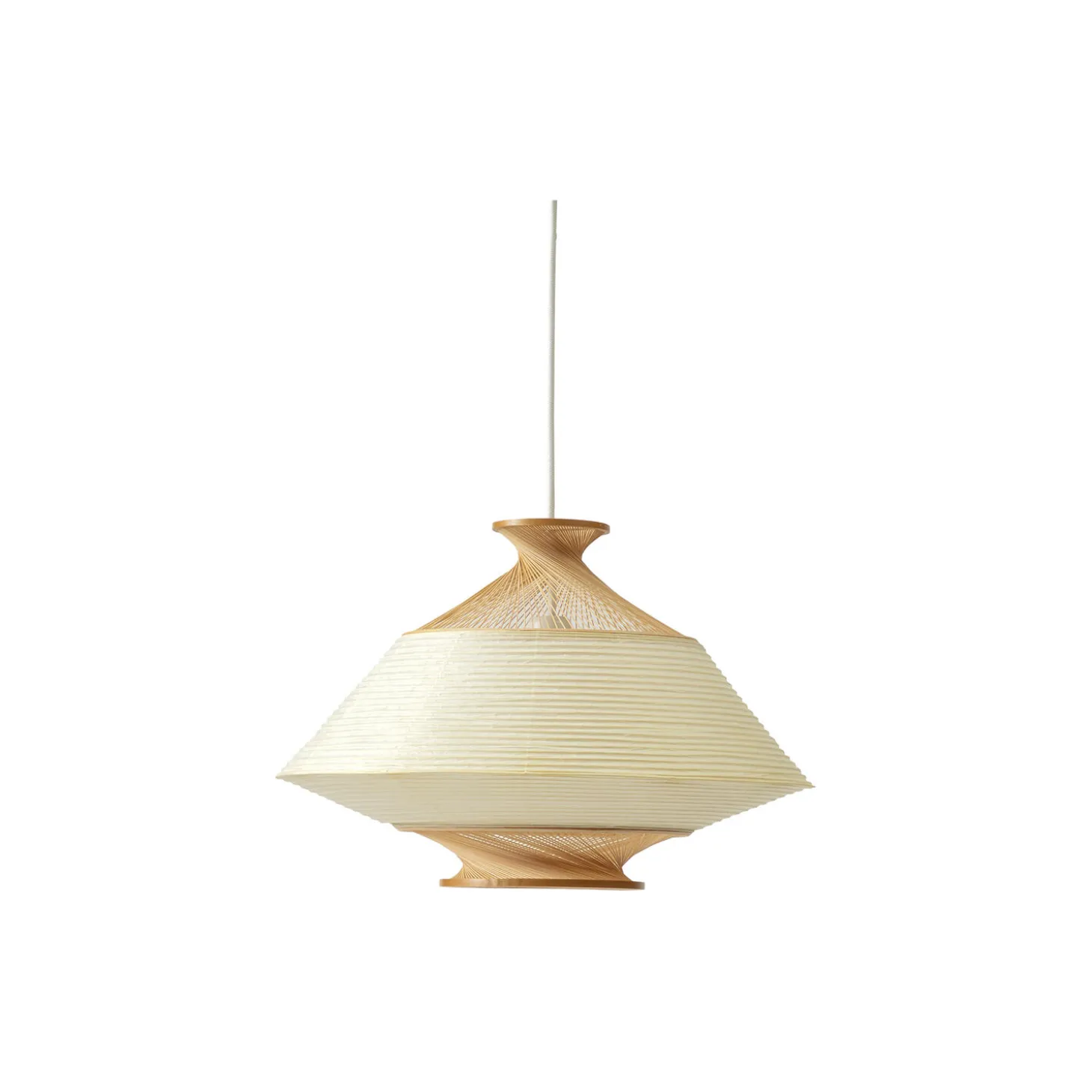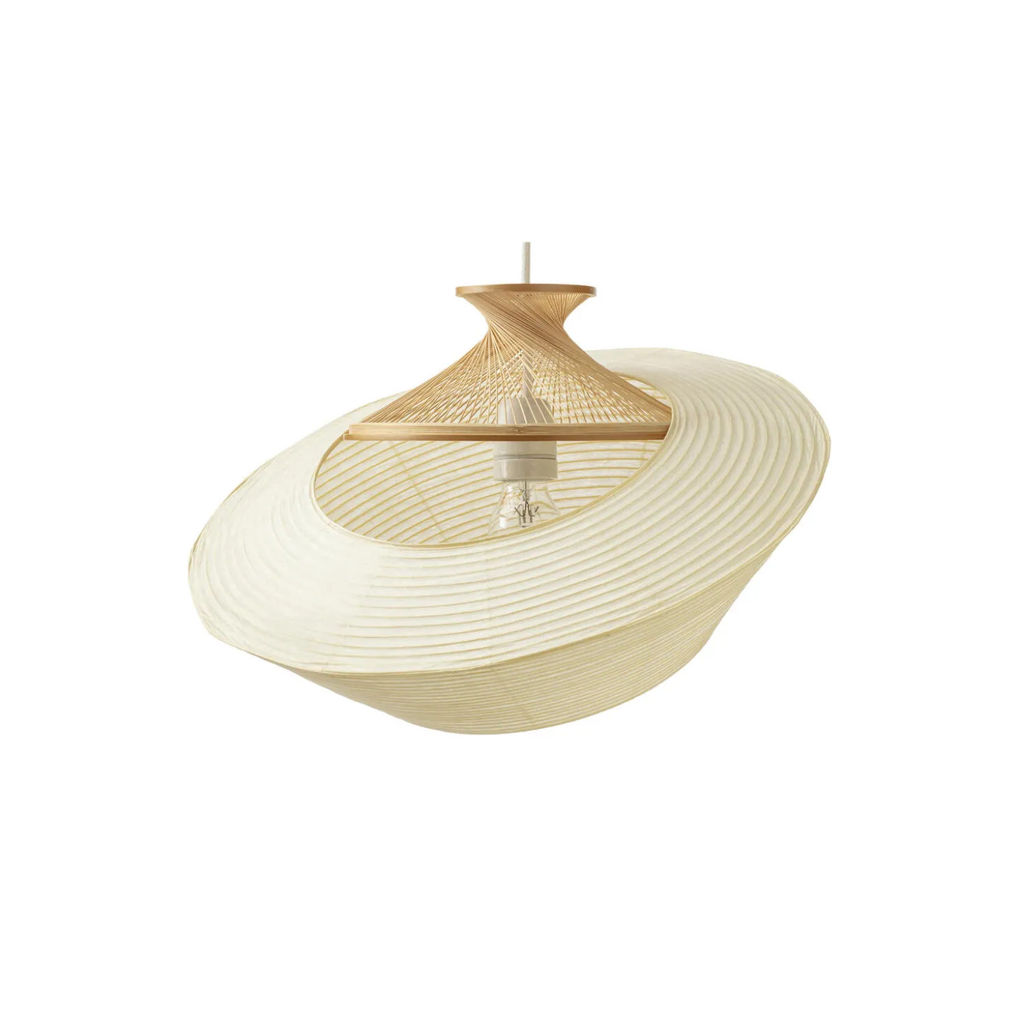 RON pendel håndlavet af bambusmestre i Japan. Aftagelig skærm som kan vendes for forskelligt udtryk fra MOTARASU. Pendlen skaber en varm stemning med det naturlige japanske højkvalitets washipapir og bambus. Normalt er papirskærme lavet med pinde der skygger for lyset men for RON er der i stedet støbt pinde i resin der leder lyset igennem.