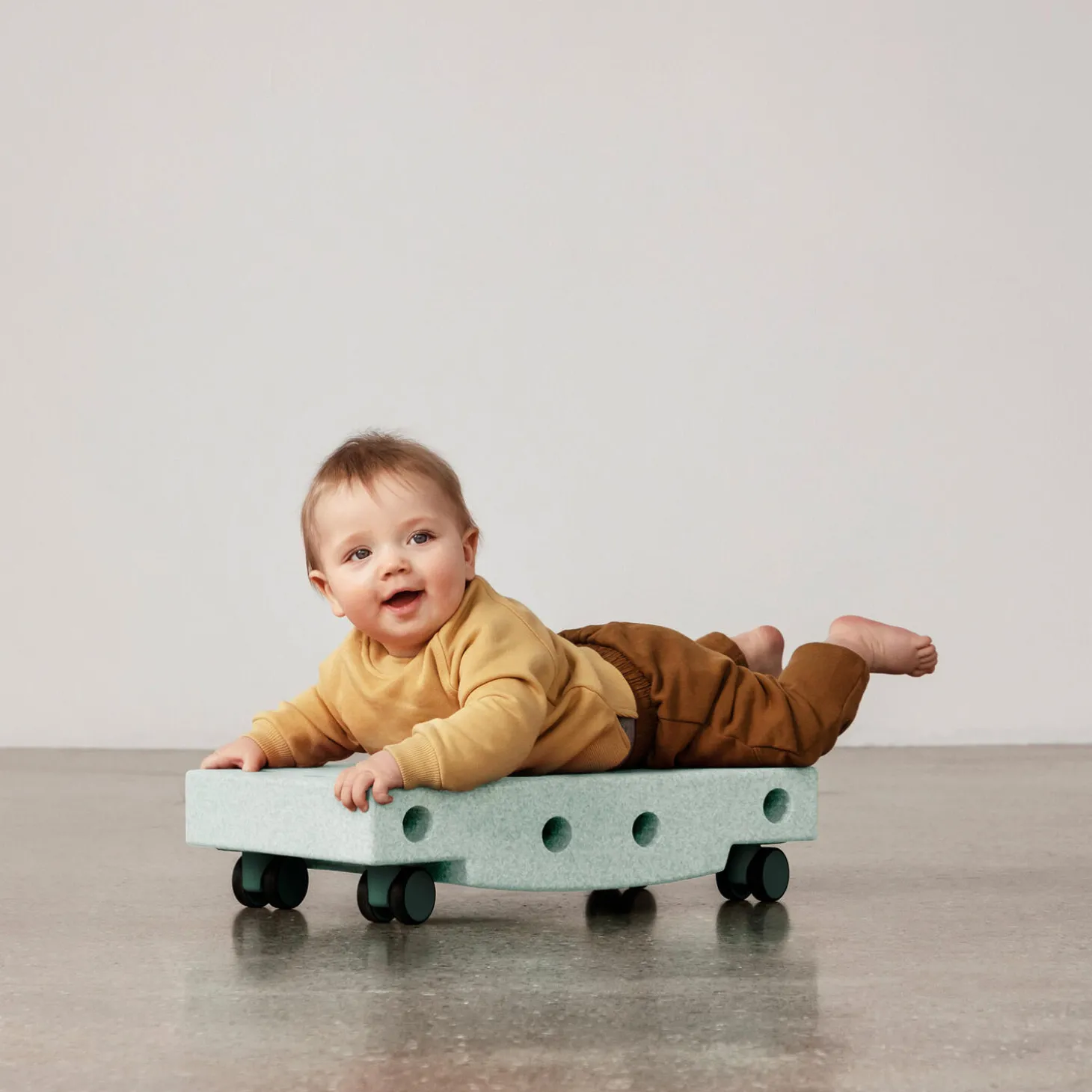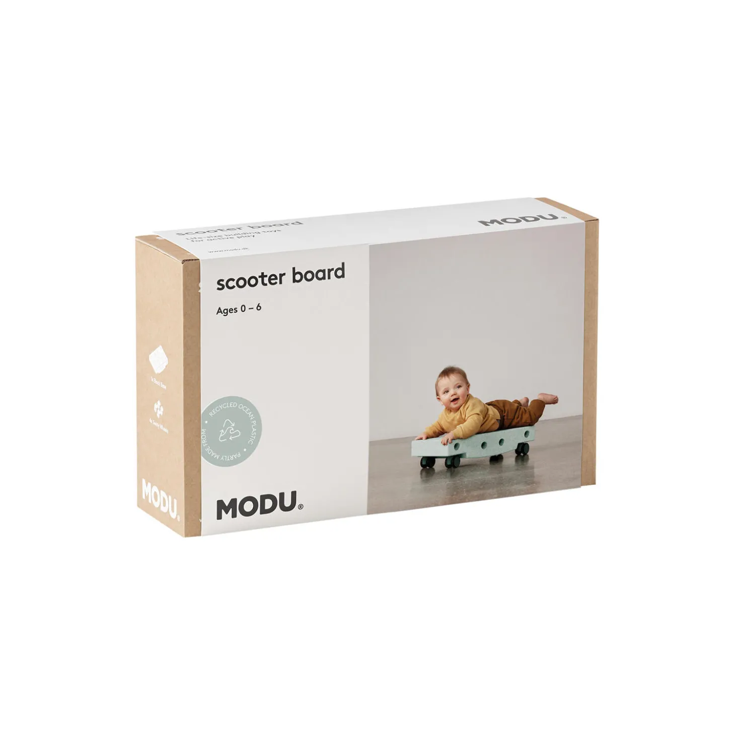 Perfekt til mavetid. Træner styrke og balance. Brug også som balancebræt.Styrk dit barns motorik med rullende leg. MODU Rullebrættet er et enkelt og alsidigt aktivitetslegetøj til grundlæggende motorisk træning med babyer og tumlinger. Læg dit barn på maven og sus rundt på gulvet, eller fjern hjulene og vip frem og tilbage. Selv små bevægelser og sanseindtryk kan bringe smilet frem hos små børn — og det bliver kun sjovere! Som dit barn vokser, kan det suse og snurre sig selv rundt helt uden hjælp fra mor og far. Fjern hjulene og brug brættet til balancetræning, eller byg det om til en gyngehest eller lille gåbil ved at tilføje andre MODU-klodser.Antal dele: 5 stk (1x klods / base, 4x drejehjul)Alder: 0 – 6 år (og resten af familien)Vægtgrænse: Maks. 50 kgMål: 50 x 30 x 12 cmPleje: Tør af, tag med i bad, tåler opvaskemaskineMaterialer: 100% genanvendeligt EPP-skum og fødevaregodkendt ABSProduktion: Produceret i Lyon, Frankrig og Odense, Danmark