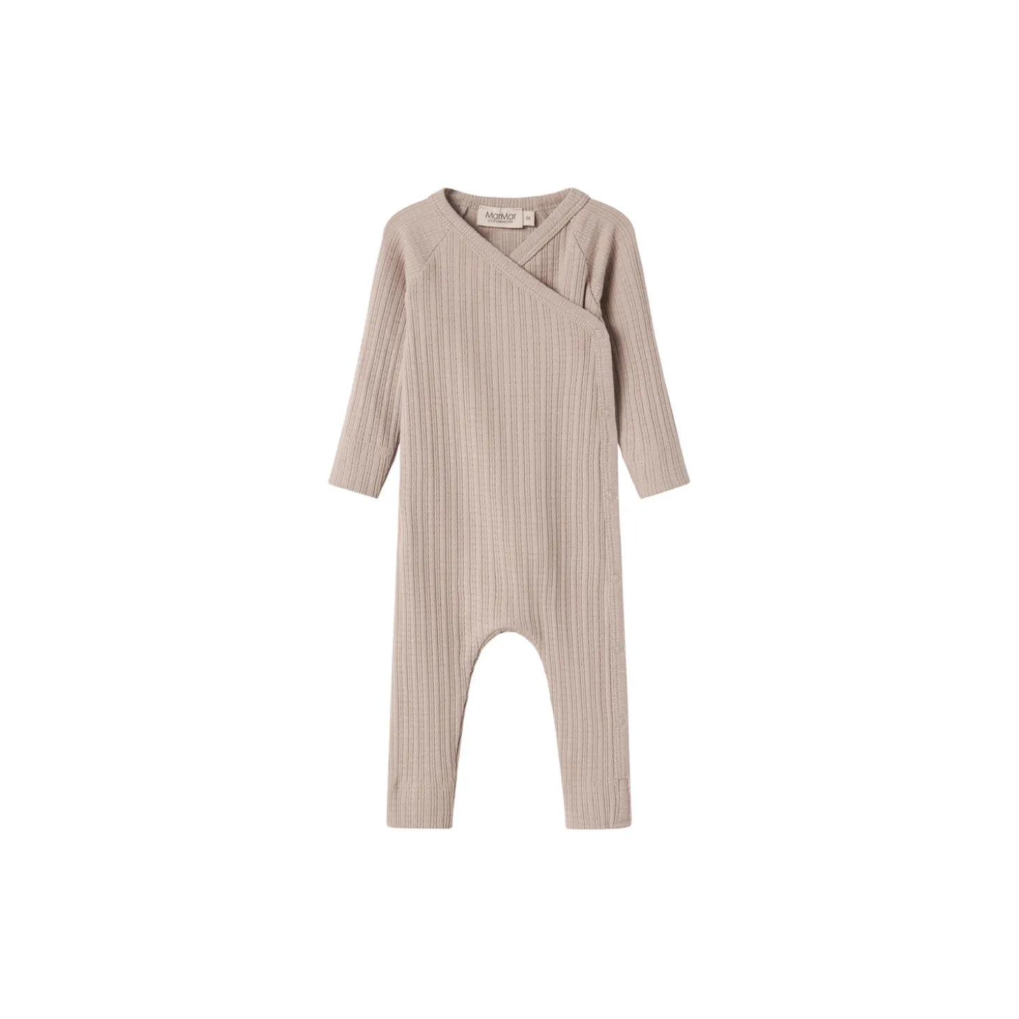 Langærmet heldragt med slå-om-lukning, dragten lukkes med trykknapper fra hals og ned langs det ene ben.
