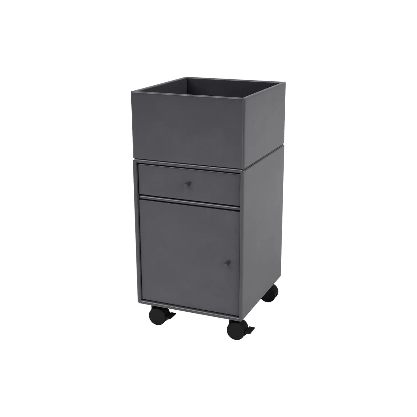 RUNNER er opbevaring på hjul, så du på hjemmekontoret eller i andre rum kan rulle det nødvendige udstyr hen, hvor du skal bruge det. Øverst er der kassen, åben i toppen, her kan du opbevare planter – alternativt, mapper, bøger, plakatrør eller lignende. Under topkassen er der en skuffe og et lille skab. RUNNER er dermed helt perfekt til ændre funktion og skabe forandring på det lille hjemmekontor.