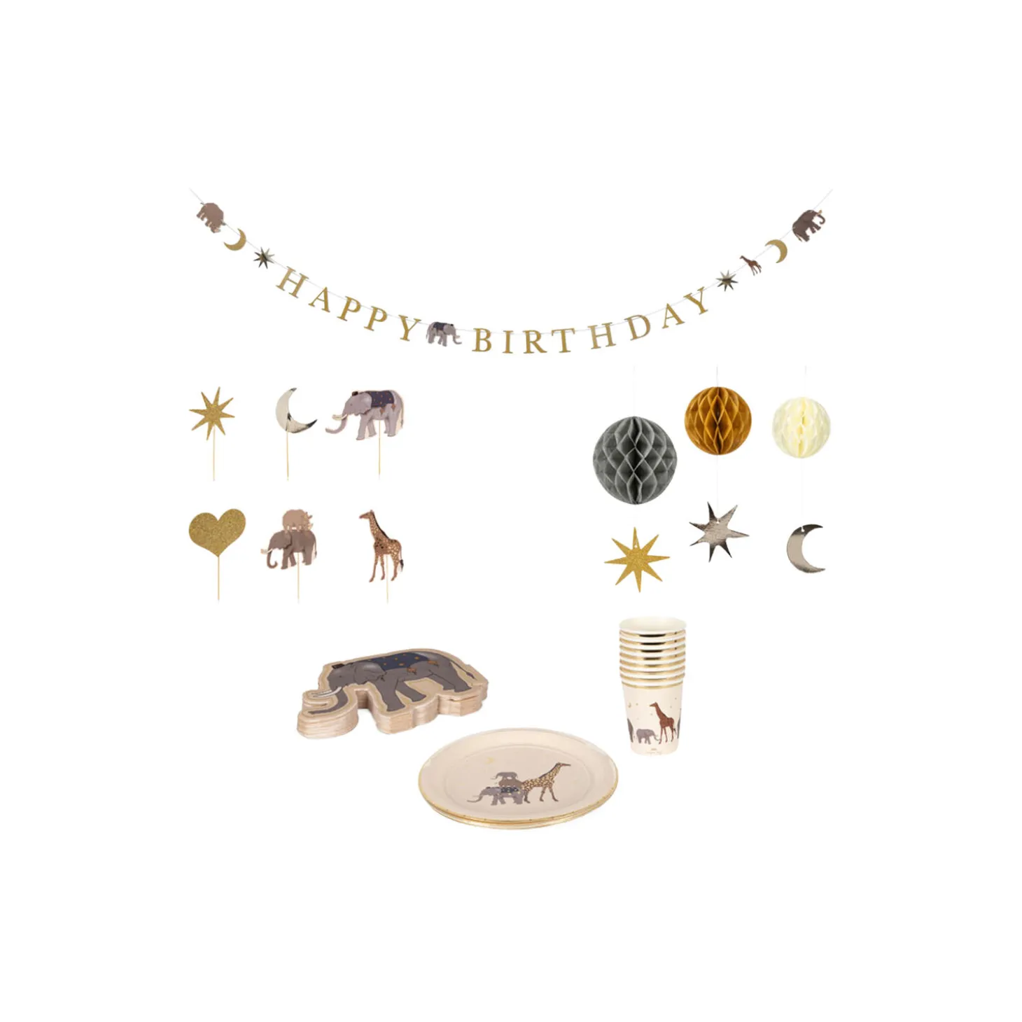The perfect set for a safari themed celebration!Contains :8 x paper cups8 x paper plates16 x paper napkins1 x garland made from paper and cotton string 1 x balloon made from aluminium foil12 x cake toppers made from paper and bamboo stickThis product is made of FSC™-certified and other controlled material.License Number: FSC C177572