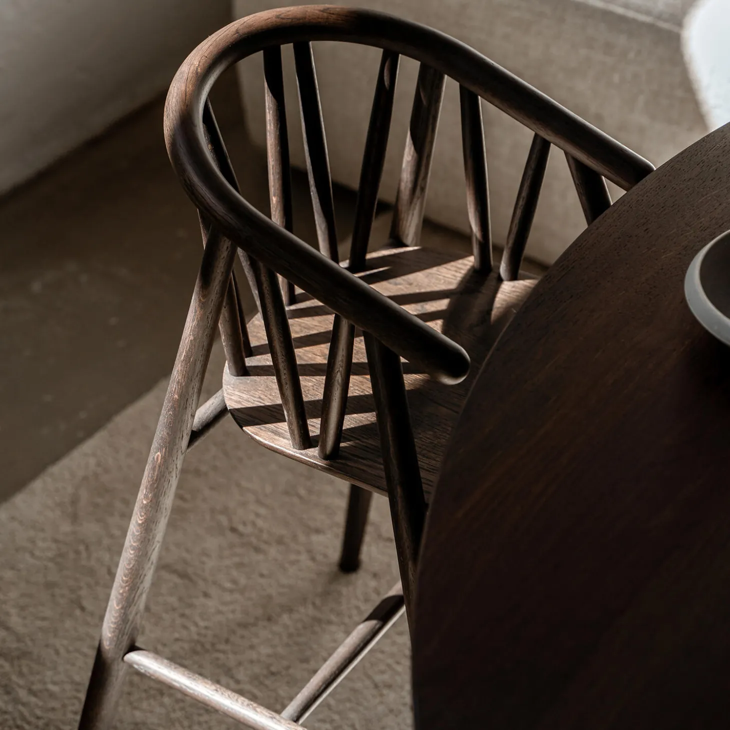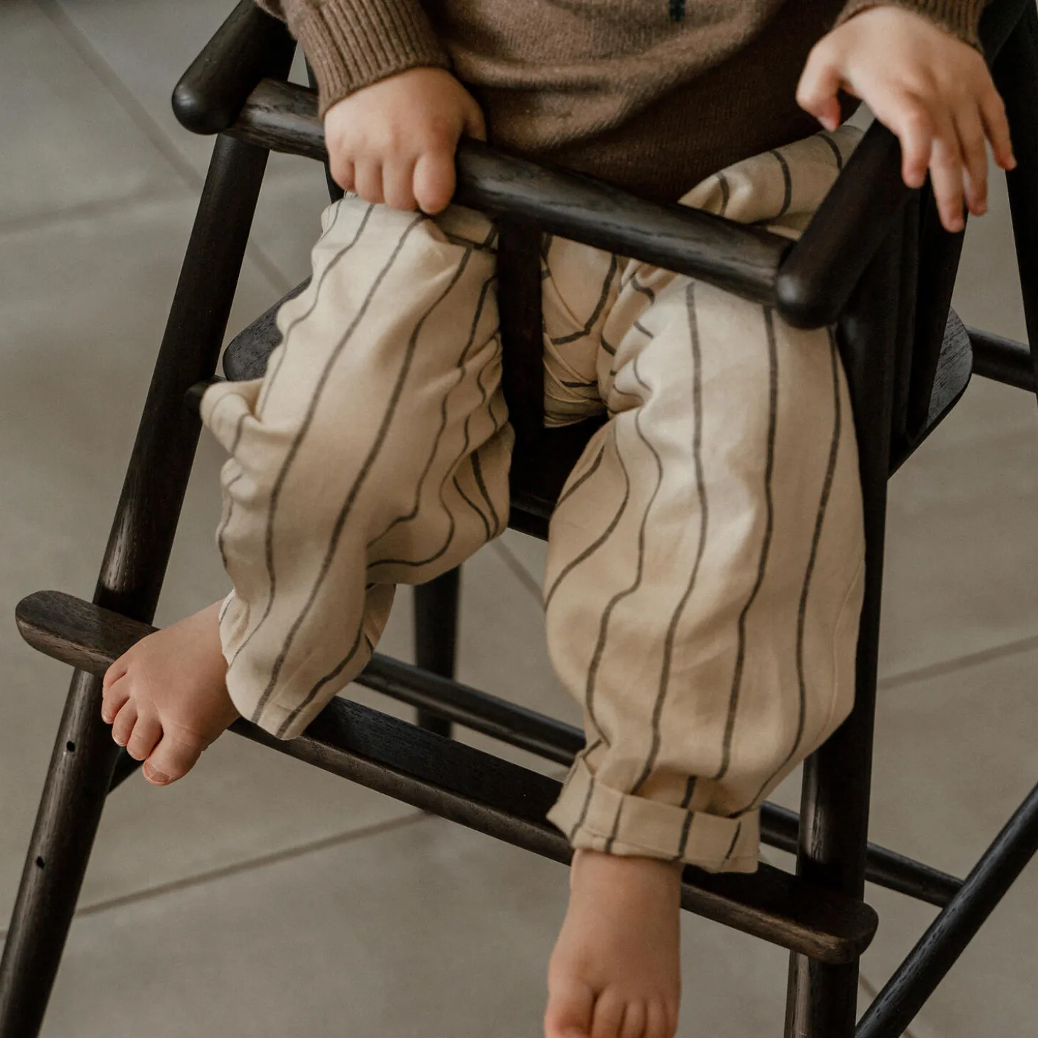 Saga Højstolen er designet af den danske møbeldesigner, Nina Bruun i 2021. Stolen kan følge barnet i de første 6 år af barndommen, da den meget enkelt kan ændres til en åben juniorstol for større børn. Designet er skabt med inspiration fra den lange danske designtradition, der bygger på sublimt design, kompromisløst håndværk og en meget lang levetid. Stolen er håndsamlet i massiv eg af erfarne italienske snedkere. Den kurvede rygstøtte er udført i et stykke egetræ, der er dampbøjet i den smukke buede form, der kendetegner de organiske former på stolen. Stolen flugter smukt med højden på spiseborde og muliggør at barnet kan sidde helt tæt til bordet sammen med resten af familien.Ved køb af stolen medfølger en lille gavepose med et sæt messingskilte og messingskruer. Skiltet kan graveres med en personlig hilsen eller navnet på barnet og herefter monteres på undersiden af sædet. På den måde vil stolen bære en lille bid af historien med sig til de næste små brugere. Stolen overholder alle europæiske sikkerhedskrav og er godkendt efter den europæiske sikkerhedsstandard EN14988:2017+A1:2020Til børn fra ca. 6 måneder og op til 6 års-alderen.