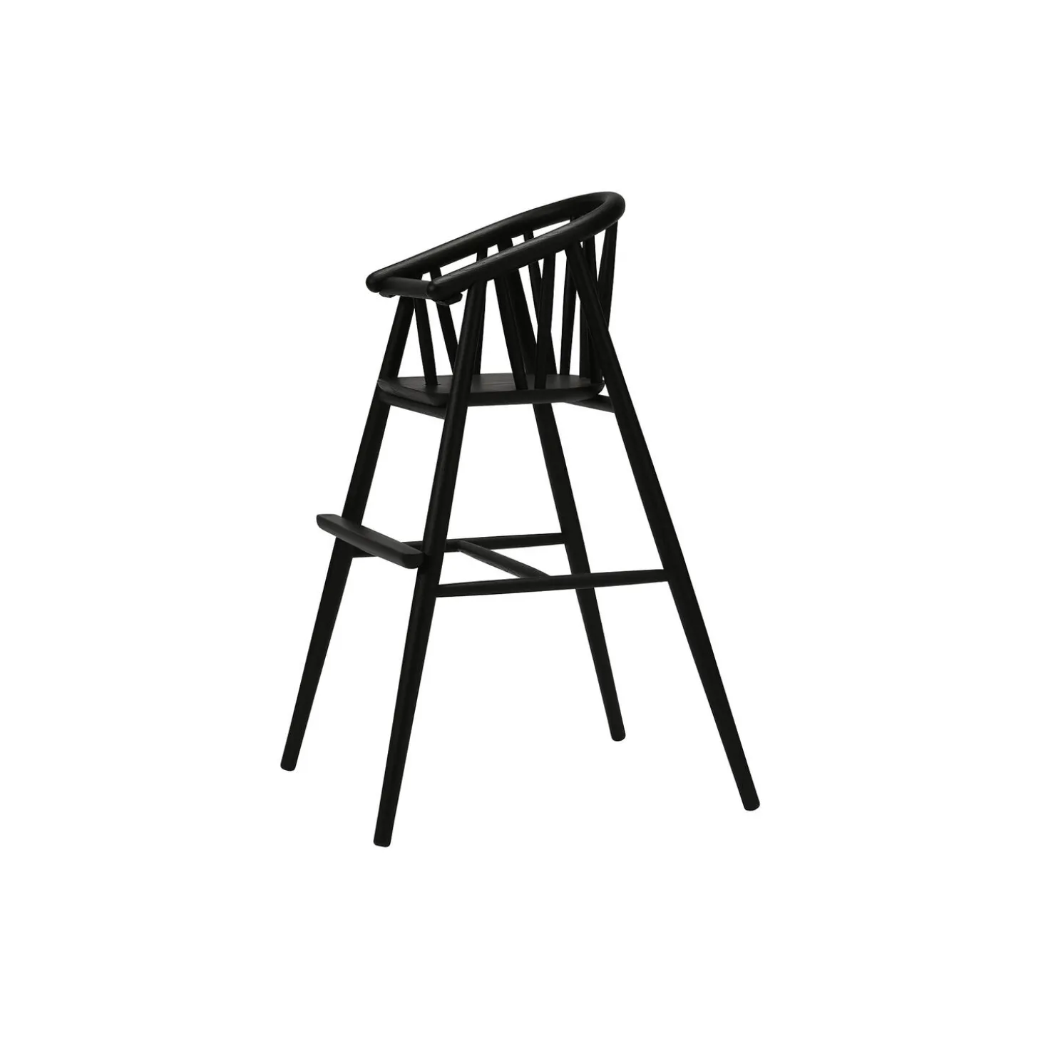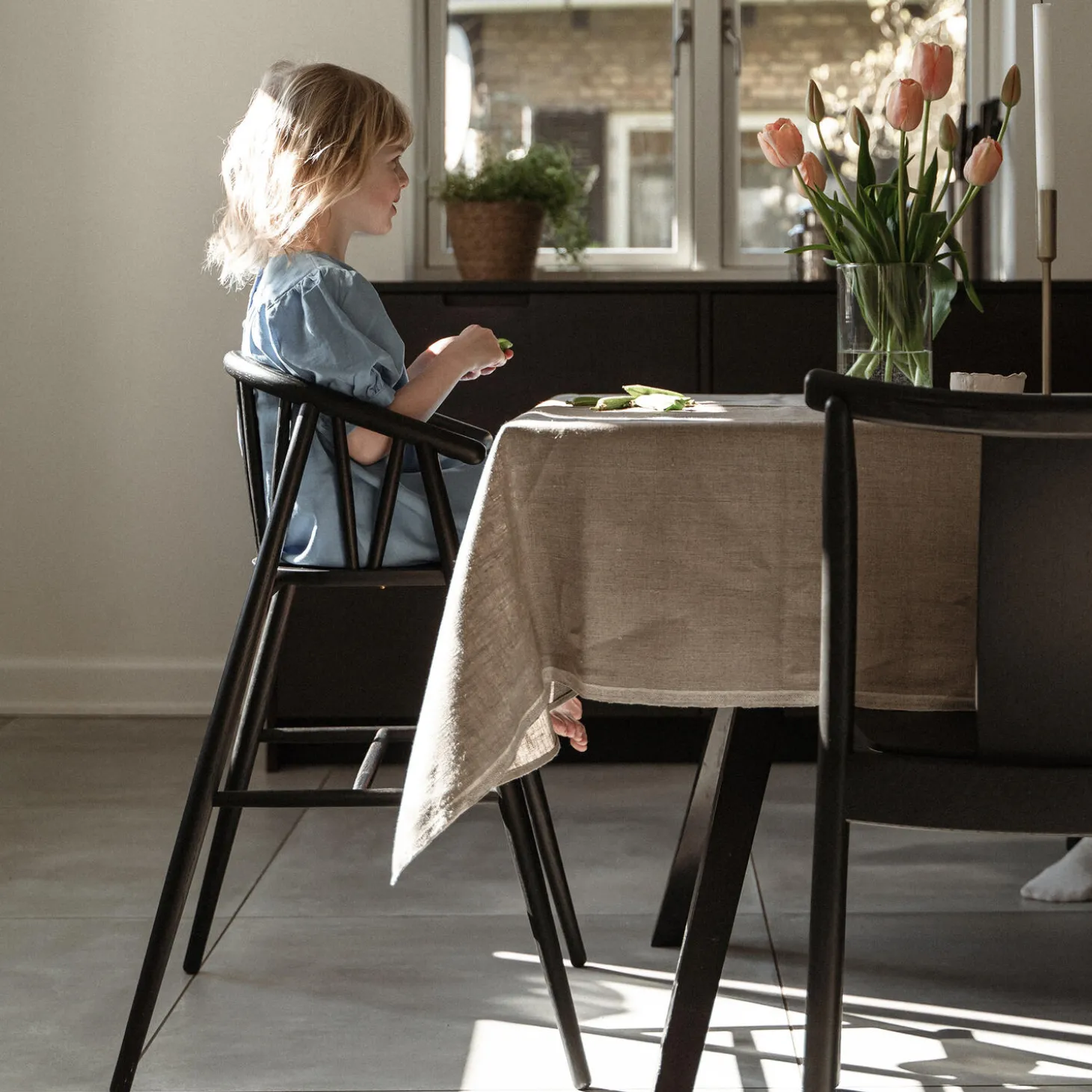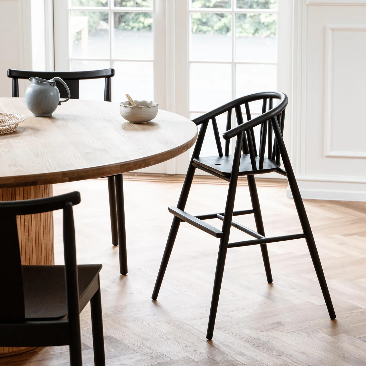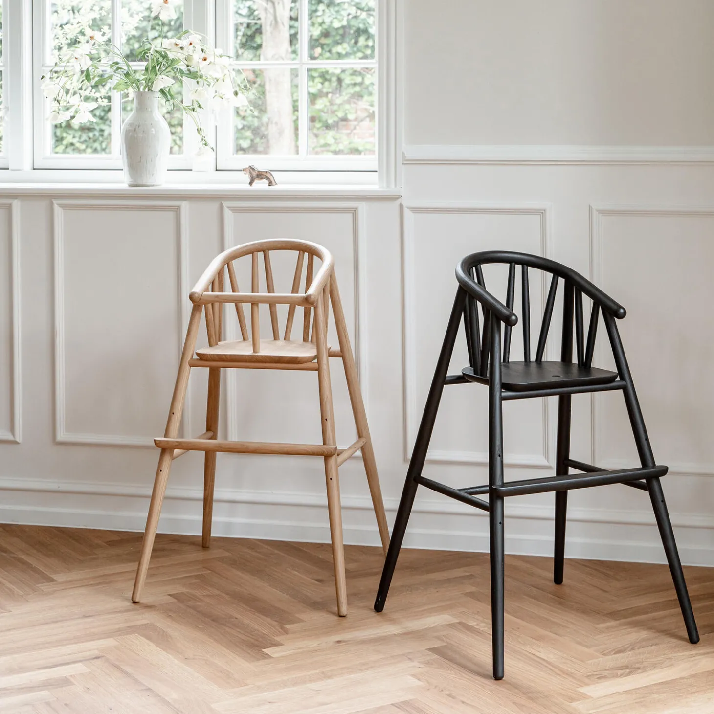 Saga Højstolen er designet af den danske møbeldesigner, Nina Bruun i 2021. Stolen kan følge barnet i de første 6 år af barndommen, da den meget enkelt kan ændres til en åben juniorstol for større børn. Designet er skabt med inspiration fra den lange danske designtradition, der bygger på sublimt design, kompromisløst håndværk og en meget lang levetid. Stolen er håndsamlet i massiv eg af erfarne italienske snedkere. Den kurvede rygstøtte er udført i et stykke egetræ, der er dampbøjet i den smukke buede form, der kendetegner de organiske former på stolen. Stolen flugter smukt med højden på spiseborde og muliggør at barnet kan sidde helt tæt til bordet sammen med resten af familien.Ved køb af stolen medfølger en lille gavepose med et sæt messingskilte og messingskruer. Skiltet kan graveres med en personlig hilsen eller navnet på barnet og herefter monteres på undersiden af sædet. På den måde vil stolen bære en lille bid af historien med sig til de næste små brugere. Stolen overholder alle europæiske sikkerhedskrav og er godkendt efter den europæiske sikkerhedsstandard EN14988:2017+A1:2020Til børn fra ca. 6 måneder og op til 6 års-alderen.