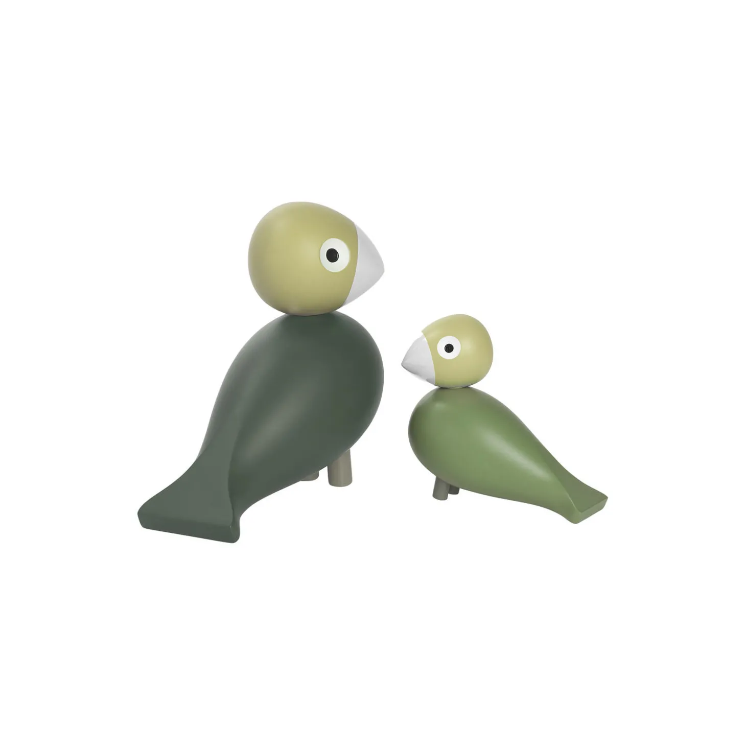 Til fejringen af dine livsbegivenheder, et minde om alle hverdagslivets lykkelige stunder og den helt særlige relation mellem forældre og børn. Med Liv&Lykke-fugleparret i det ikoniske Kay Bojesen-formsprog spredes vingerne ud for alle, der holder af og passer på hinanden. Fugleparret er fremstillet i FSC®-certificeret bøgetræ og består af en stor og en lille fugl, som I kan vælge at bruge sammen eller hver for sig til at udtrykke jeres unikke fortælling, lige præcis dér hvor I er i livet. Den store fugl kommer i en afdæmpet mørkegrøn og er med sine 10 cm i højden en anelse mindre end de andre i Kay Bojesens populære serie af sangfugle, mens den lille fugl på 6 cm med en krop i en lidt varmere grøngul er samme størrelse – og nøjagtig lige så nuttet – som de fugle, du kender fra Kay Bojesen-uroen i Babies-serien med fugle og kugler i træ, malet i forskellige farver. For at markere fugleparrets iboende forbundethed er hovedet på begge Liv&Lykke-fugle malet i samme beige farve og med ens hvide næb. Et symbol på at de både helt tæt sammen og hver for sig altid vil passe på hinanden. Liv&Lykke er formet af kærlighed, håb og omsorg – og en dybt forankret hyldest til selve livet. Uanset hvilken historie du fortæller, føjer Liv&Lykke et nyt kærligt kapitel til historien om dansk design og Kay Bojesens originale fortællinger i træ. Lad for eksempel begge fugle stå sammen i soveværelset i barnets allerførste måneder som en rede af lykke så fin som de blødeste fjer, og lad herefter den store fugl flyve med det lille barn ind på børneværelset – eller omvendt. Og senere i livet kan I så give det nu store barn den lille fugl med på efterskole eller på udlandsrejsen og beholde den store fugl derhjemme som et smukt og livgivende symbol på evig forbundethed, uforbeholden kærlighed og et håb for en lykkelig fremtid for et ungt menneske. Som dette særlige dualistiske designikon vil Liv&Lykke-fugleparret også være den helt perfekte gave til den nybagte storesøster eller storebror eller som en kærlig hilsen mellem to venner, som et symbol på livets store og små øjeblikke, et fokus på samhørighed og lykkelige stunder sammen. Med deres elegante og universelle grønne farver vil Liv&Lykke-parret stå som en for evig stedsegrøn blomsterbuket i fugleform, der vil passe perfekt ind i ethvert hjem. Og ligesom Liv&Lykke-navnet selvfølgelig emmer af livslykke og familiær forbundethed, er også farverne fulde af symbolik. Grøn er naturligvis håbets farve og symboliserer netop den frodighed, det liv og det spirende håb af lykke, der omfavner livets små og store mirakler. Den grønne fjerpragt og de varme gule nuancer giver Liv&Lykke et afbalanceret og harmonisk look, der vil skabe en rede af liv og lykke, hvor end de placeres.