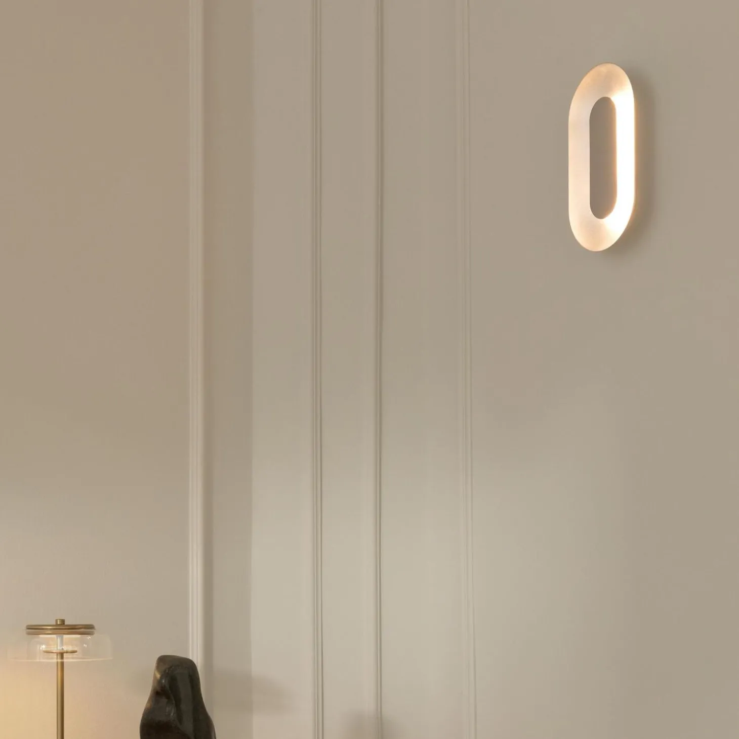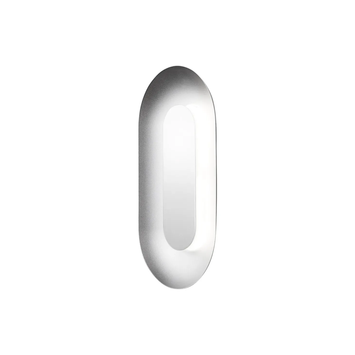 Sasi Small er en dekorativ væglampe designet med øje for blød formgivning, en harmonisk farvepalette og nøje udvalgte materialer. Lampen består af en oval sølvskærm i anodiseret aluminium, og en mindre form med spejleffekt er placeret i midten. Den blanke skærm skjuler det integrerede LED-modul, der spreder og reflekterer et dekorativt lys. Sasi Small væglampen kan bruges som vægdekoration over det lille konsolbord i hjørnet, hvor Sasi fungerer som en skulptur i indretningen, når lampen er slukket.