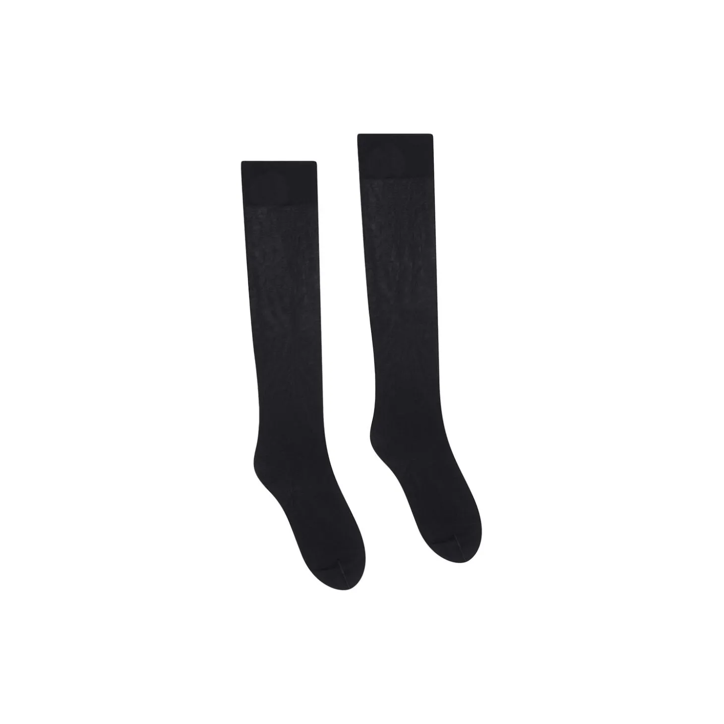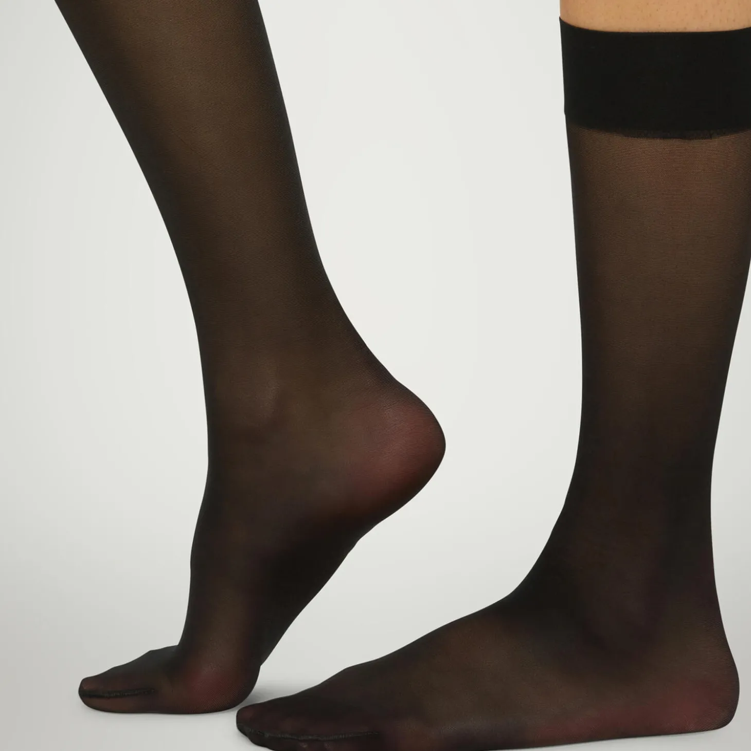 Disse delikat gennemskinnelige knæhøjder bringer et glimt til benene og forbliver trygt på plads med en bred blød manchet. 20 den.