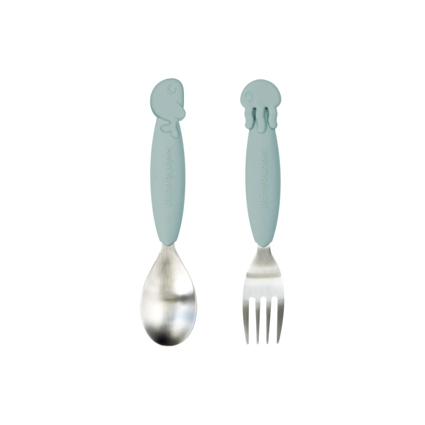 Sea Friends YummyPlus ske & gaffel sæt i rustfrit stål og 100% fødevarekvalitet silikone fra Done By Deer.Farve: blå. Mål: H: 1,3 x L: 14 x B: 3 cm.