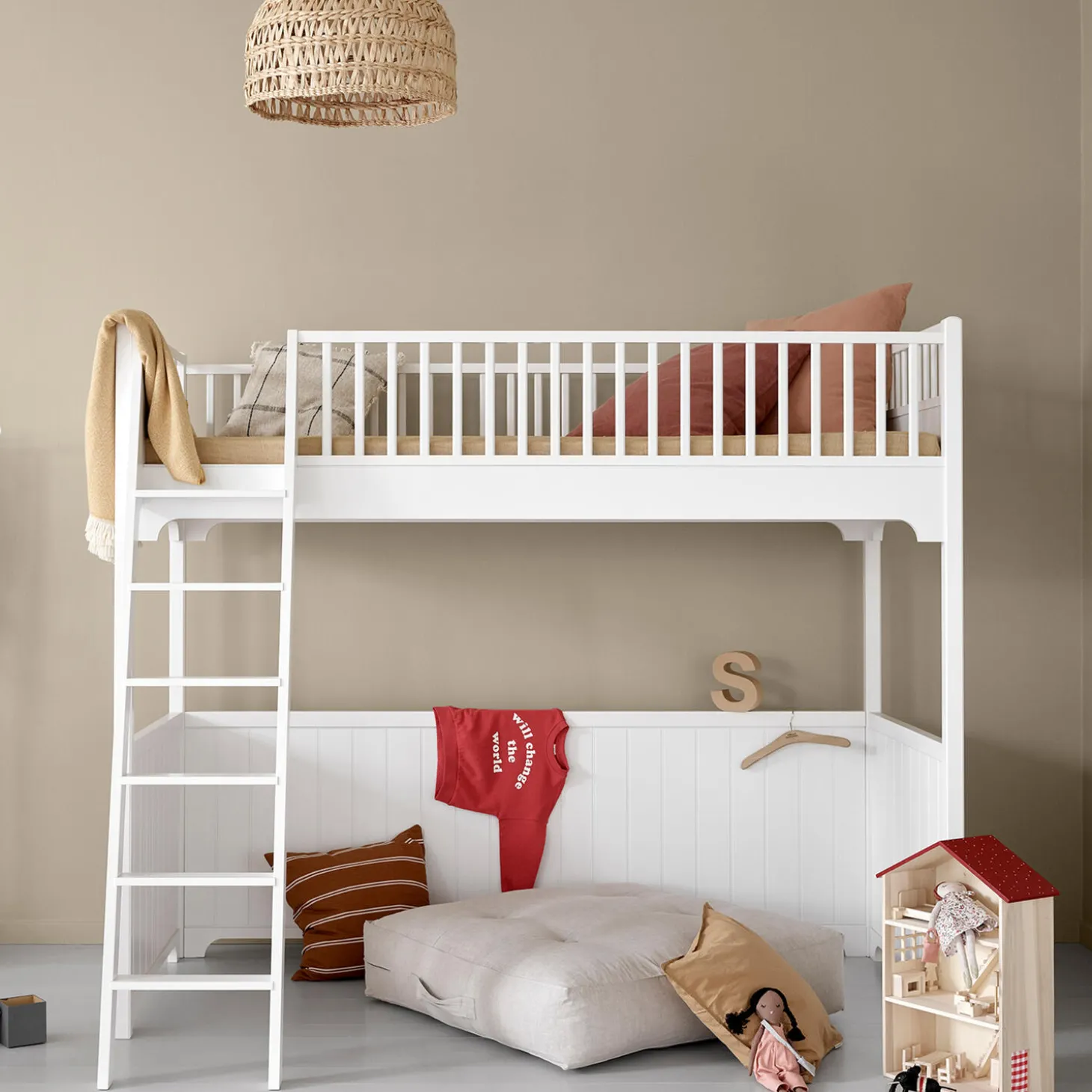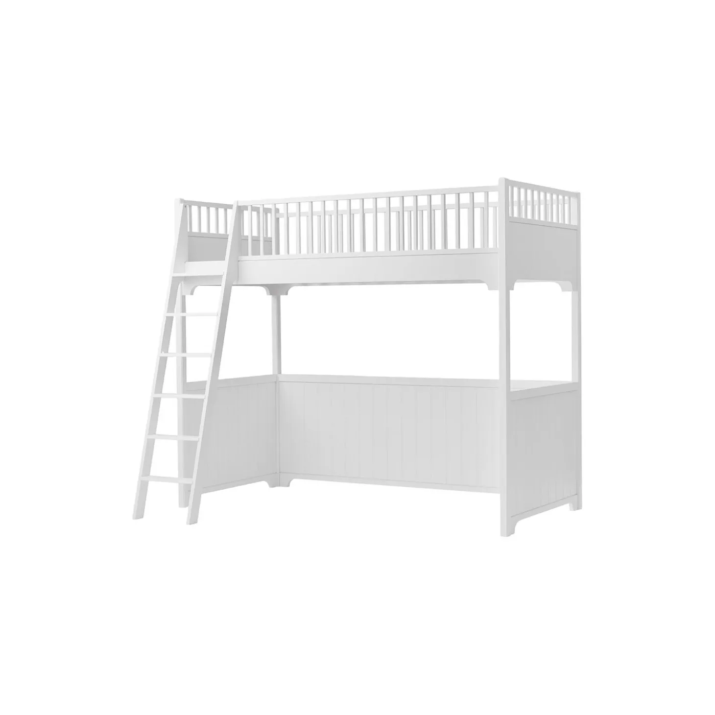 En højseng giver mulighed for at indrette et ekstra lille, personligt rum i børneværelset.Under højsengen er der fx plads til at indrette et kreahjørne med bord og stol eller et pudehjørne, hvor barnet kan fordybe sig i en bog. Mulighederne er mange, og barnets fantasi kan frit udfolde sig.Nederst er højsengen beklædt med et lodret profileret træpanel, der giver en smuk og klassisk, skandinavisk indramning af barnets personlige rum.Trinene på stigen er brede, så barnet let og sikkert kan komme op og ned. Stigen kan valgfrit placeres i enten venstre eller højre side.Sengen er en del af Seaside Classic serien, der er designet i en fin og nordisk stil. Små, enkle detaljer understreger det tidløse design, der passer ind i de fleste hjem.Seaside Classic serien er fremstillet af birketræ og MDF, der er konstrueret træ, der består af 60% birk, 20% fyrretræ og 20% asp træ. MDF er meget stærkt og holdbart.De ikke-synlige skruer giver sengen et rent og eksklusivt design og er særligt kendetegnende for Oliver Furniture. Designet er let og fint og holder fra generation til generation.Serien er produceret i Europa og overholder de strenge EU-krav for sikkerhed og sundhed. Produkterne er malet med ikke-giftig, vandbaseret maling.Bæreevne (statisk vægt): 120 kg SIKKERHED OG KRAVI henhold til EN 747 er højsenge og den øverste seng i køjesenge ikke egnet til børn under 6 år på grund af risikoen for fald.Et mindre barn kan sove i den nederste køjeseng, eventuelt med en sengehest for ekstra sikkerhed.