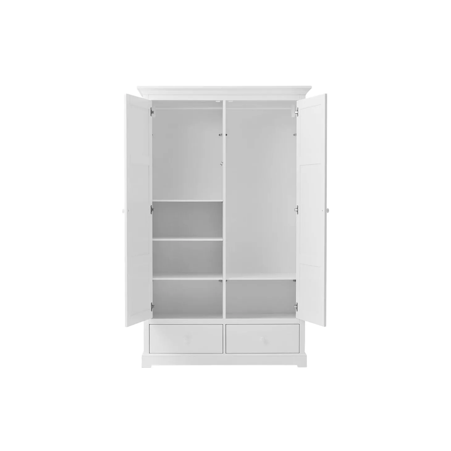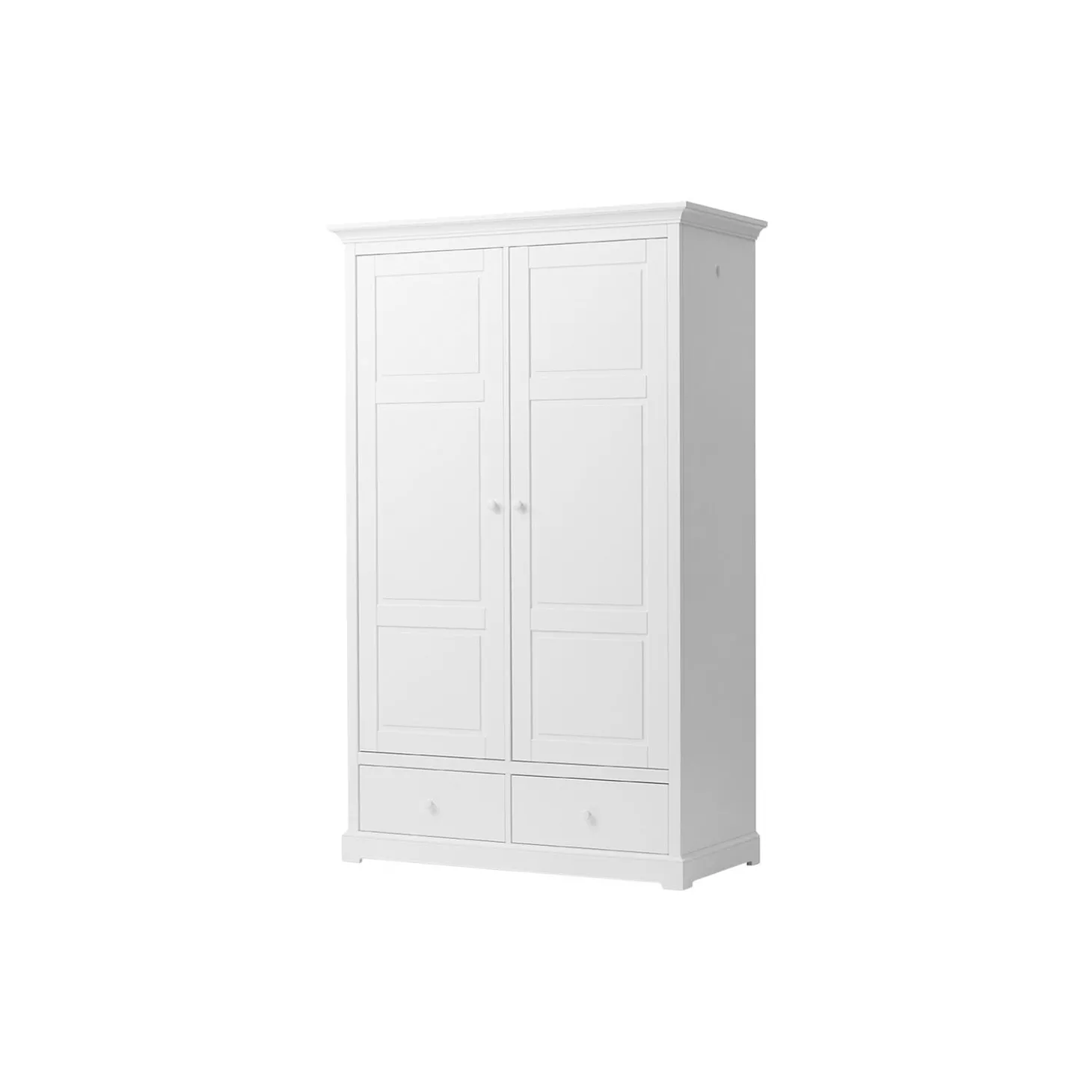 Smukt og klassisk klædeskab med mange, gode opbevaringsmuligheder til børneværelset.Skabets indretning er fleksibel med flytbare hylder, dybe skuffer og en gennemgående bøjlestang. Her er plads til alt fra sengetøj, tøj og legetøj.Klædeskabet har skuffeskinner af høj kvalitet, og både skinner og hængsler på dørene har soft close.Som en ekstra, lille detalje kan der skydes en bøjleknage ud på klædeskabets sidegavle. Her kan man hænge yndlingskjolen, sværdet eller andre fine ting, der gerne må vises frem.Klædeskabet kan også bruges i forældrenes soveværelse eller i entreen til jakker, sko og huer.Skabet er en del af Seaside Collection, der kendetegnes af en klassisk nordisk lethed. Med sit elegante, tidløse udtryk og den høje kvalitet, bliver det let en favorit fra generation til generation.Seaside klædeskabe er fremstillet af MDF, der er konstrueret træ, der består af 60% birk, 20% fyrretræ og 20% asp træ. MDF er meget stærkt og holdbart.De ikke-synlige skruer giver skabet et rent og eksklusivt design og er særligt kendetegnende for Oliver Furniture. Designet er charmerende og meget klassisk. Inspirationen er hentet fra nordiske møbeltraditioner og holder fra generation til generation. Både skuffeskinner og hængsler på dørene har soft close, så små fingre ikke bliver klemt.Produktet er produceret i Europa og overholder de strenge EU-krav for sikkerhed og sundhed. Produktet er malet med ikke-giftig, vandbaseret maling.