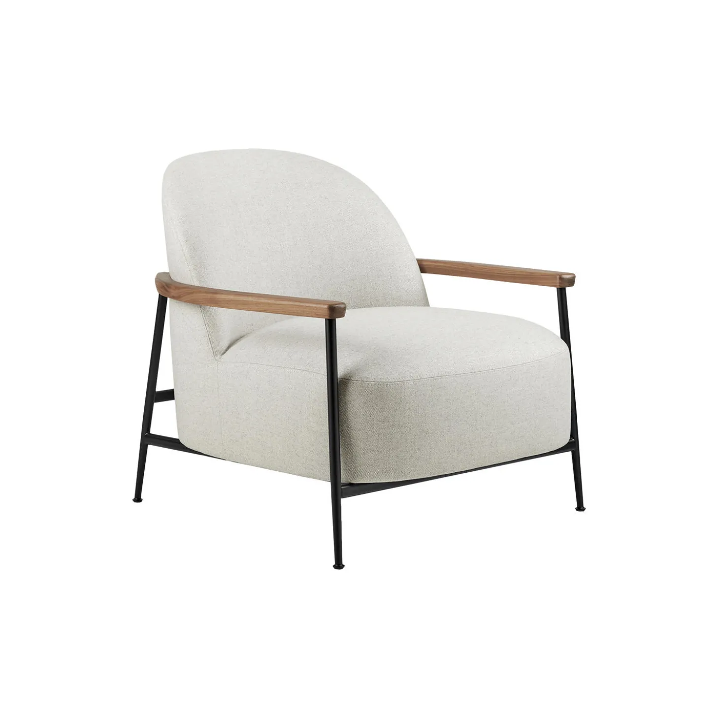 Sejour Lounge Chair with Armrests fuldpolstret i Flair Special 201 tekstil af Dedar, armlæn i olieret amerikansk valnød og stel i lakeret stål fra GUBI. Farve: Flair Special 201/black matt. Mål: H: 71 x B: 73 x D: 80 cm. Siddehøjde: 41 cm. Design: GamFratesi.