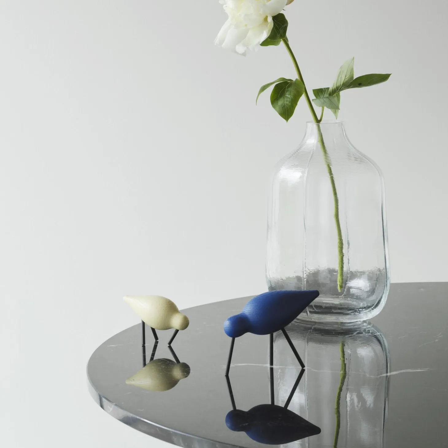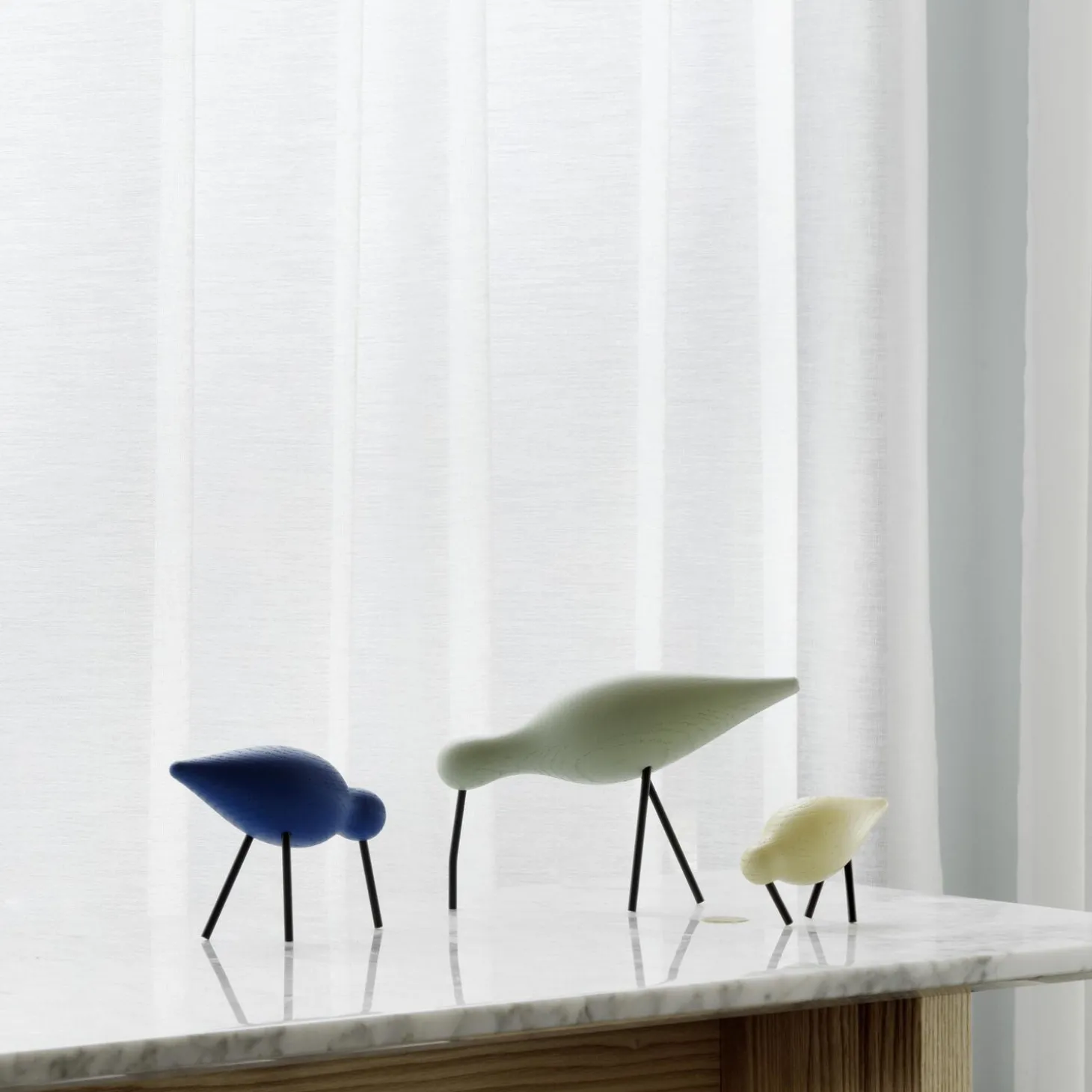 Den islandske designer Sigurjón Pálsson har skabt en serie af karakterfulde træfugle i eg, ask og valnød. Shorebirds er drejet af solidt egetræ, asketræ eller valnøddetræ, og deres simple silhuet uden dekoration giver dem et næsten stiliseret udtryk. Samtidig er der stor omtanke for de små detaljer, og variationerne mellem kroppens tykkelse, halsens længde og stillingen på ben og næb giver de tre fugle hver deres unikke personlighed og gør designet levende.