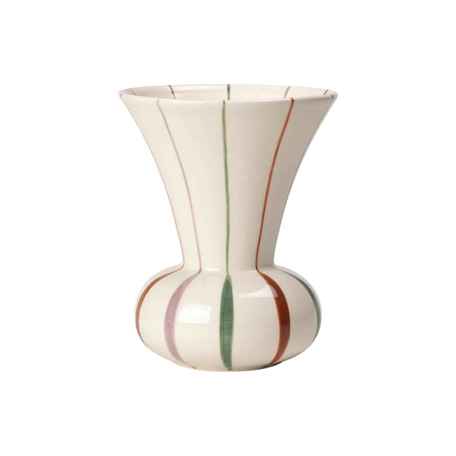 Med naturen som inspirationskilde har MeyerLavigne skabt to nye vaser for Kähler med en unik blomstertragt lignede form. Vasen har medfølgende keramikplade med huller inspireret at lotusplantens frøstand, der gør det muligt at arrangere blomsterne præcis, som man vil have dem. Vasen kan naturligvis også bruges på traditionel vis uden pladen til en almindelig bundet buket. Vasen er lavet i stentøj, og som Kählers håndværksmæssige tradition foreskriver det, er vaserne håndmalede og har liv, dynamik og autenticitet i udtrykket. Vasen er dekoreret med striberne der starter brede på den runde del af vasen og bliver tynde og fine på den tragtformede del. Striberne er i mosgrønne, terracotta og lilla afdæmpede farver, der smukt komplementerer hinanden. Design MeyerLavigne