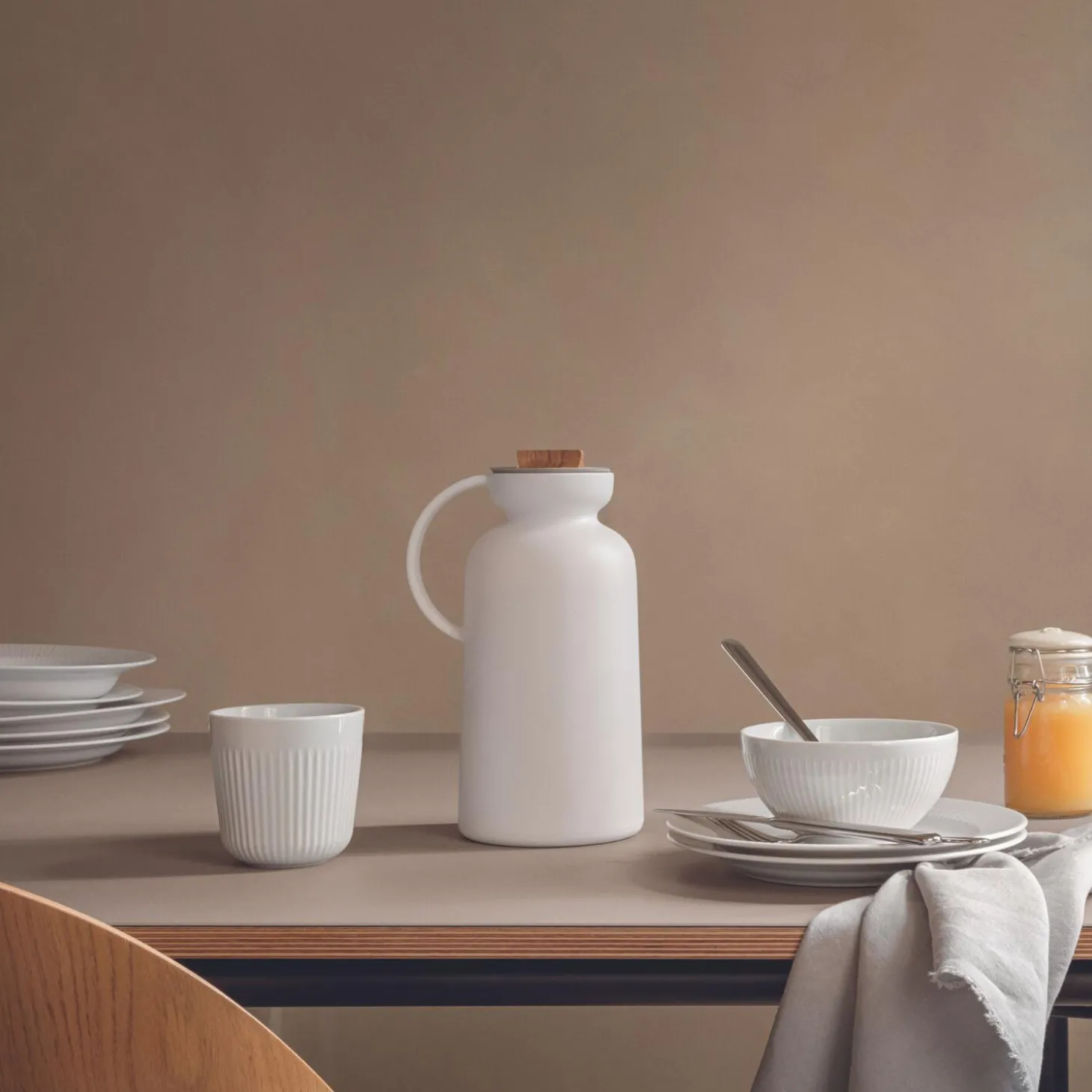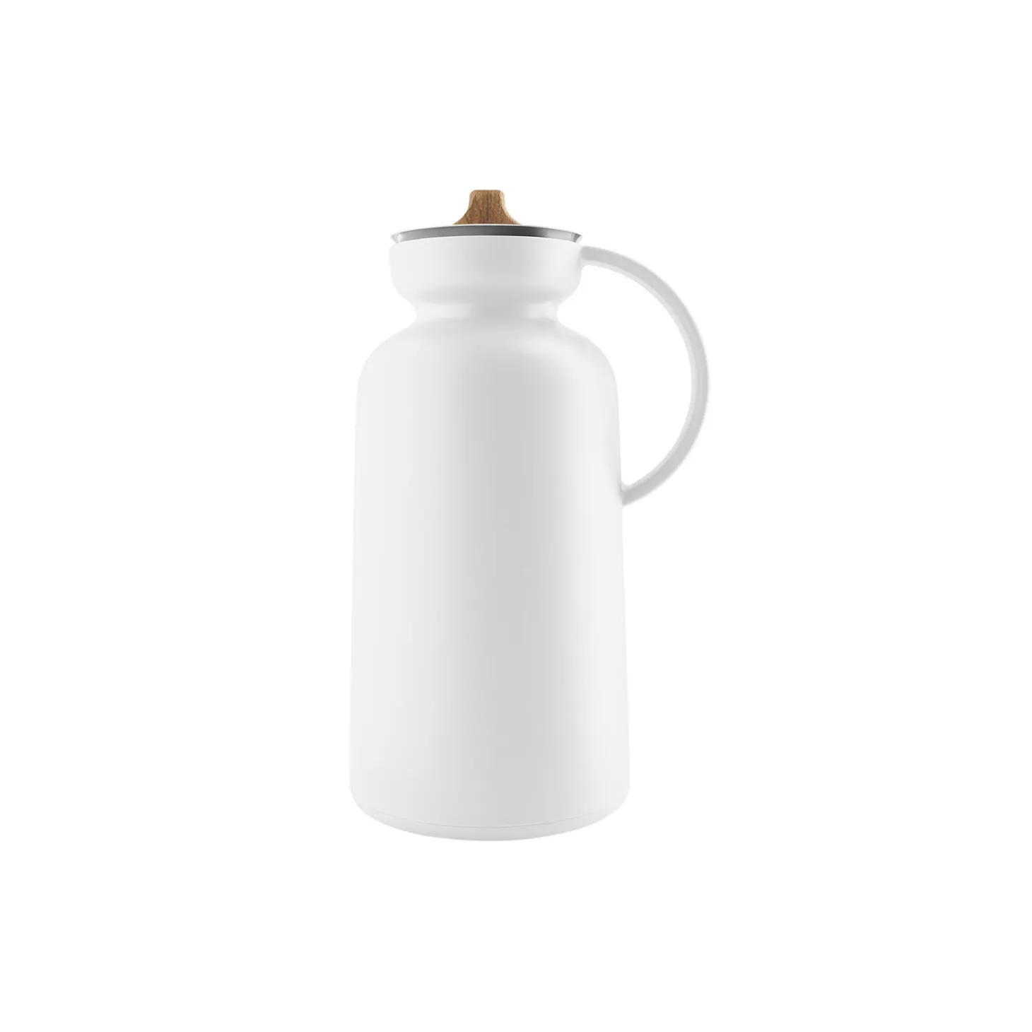 Bag Silhouettes indbydende ydre gemmer sig en indsats af stål, som gør termokanden robust og hårdfør, og så tåler den tilmed maskinopvask (dog ikke låget, der skal tørres med en opvredet klud). Termokanden holder på varmen i timevis, og en praktisk hældekrave af stål forhindrer indholdet i at dryppe på bordet. Egetræet vedligeholdes ved regelmæssig oliering.