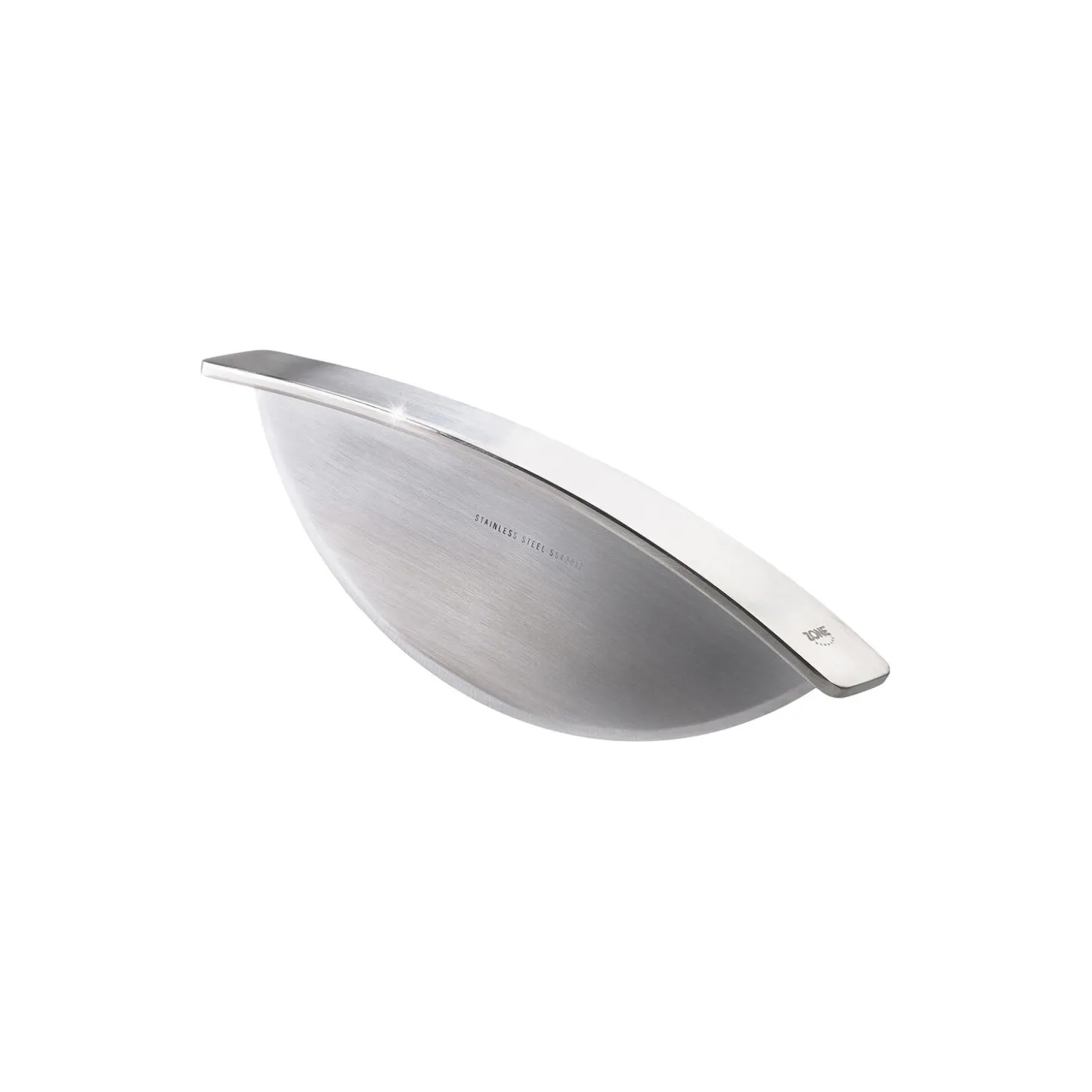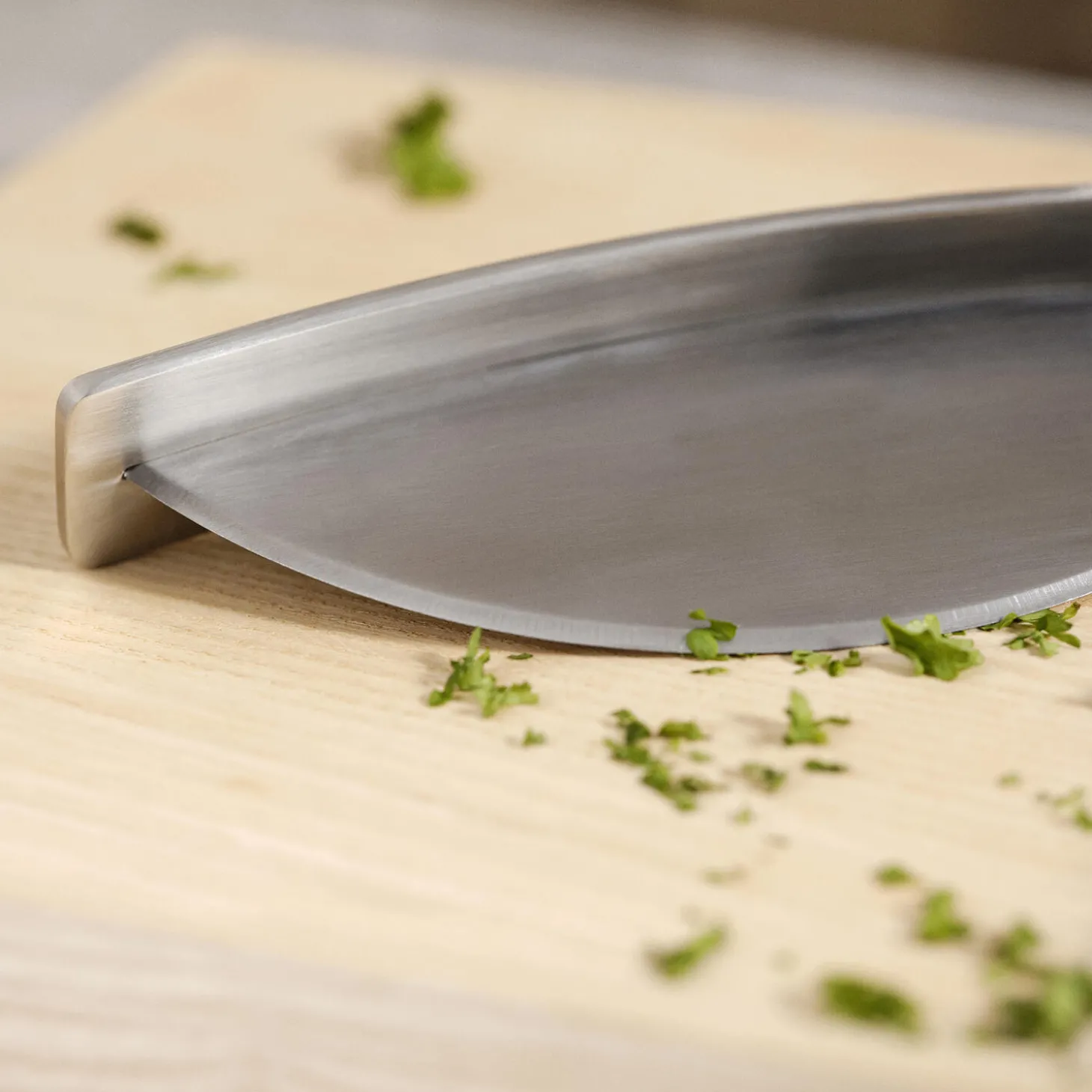 Uundværligt køkkenværktøj i praktisk format. Takket være knivens halvmåneform kan du snitte urter, nødder m.v. i en behagelig vuggende bevægelse. Kniven fylder ikke meget i skuffen, og dens skarpe stålklinge er godt beskyttet af den medfølgende plastskinne. Vask den op i hånden, så holder den sig knivskarp længe. Tip: Prøv den også, når du skærer pizza!