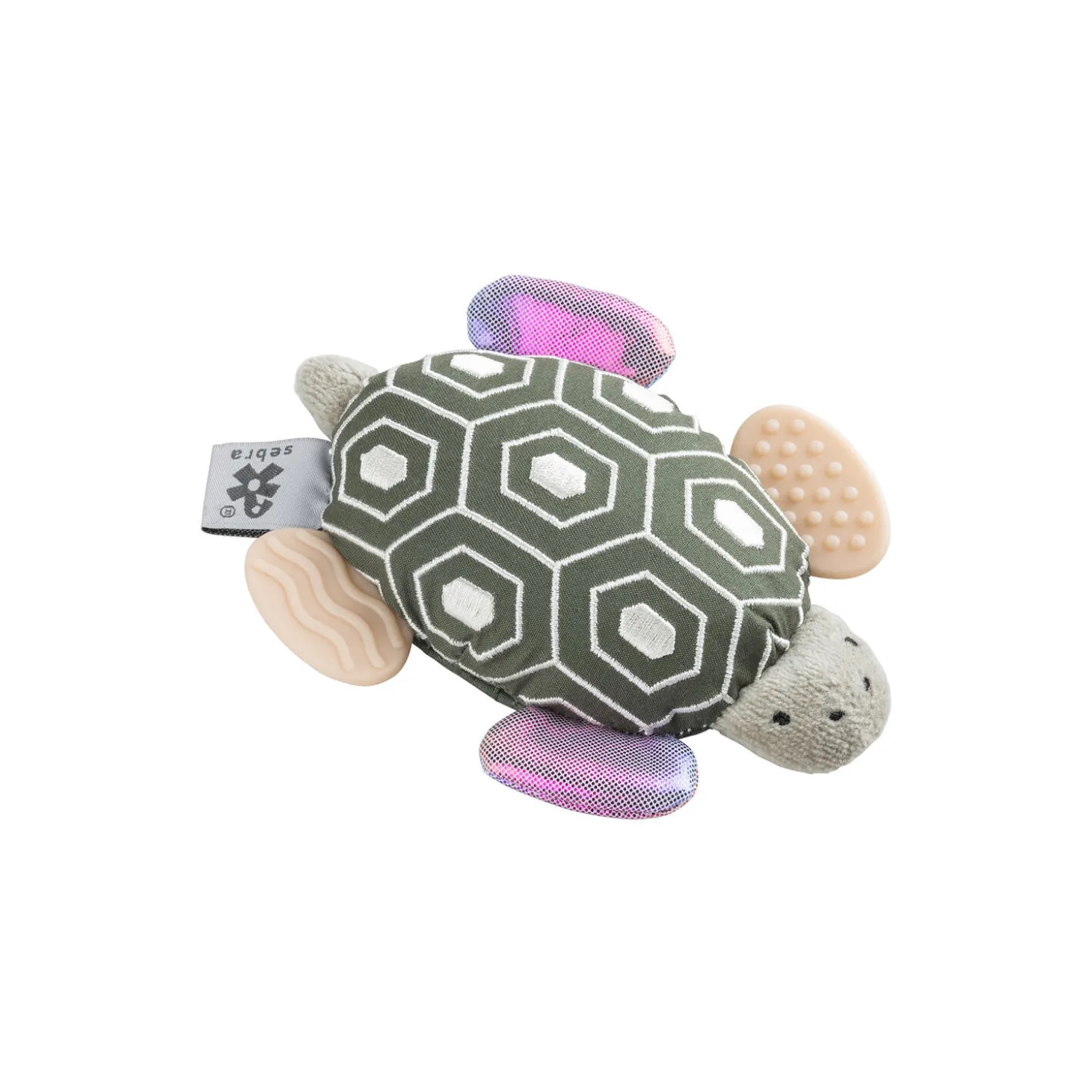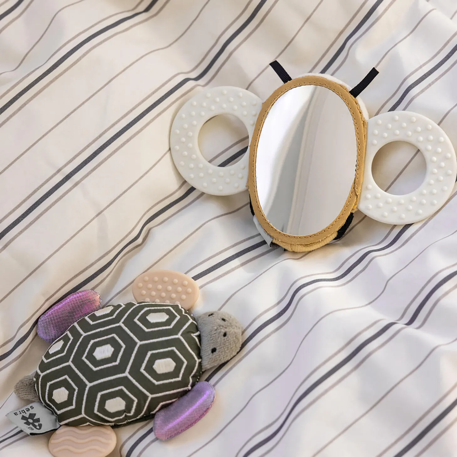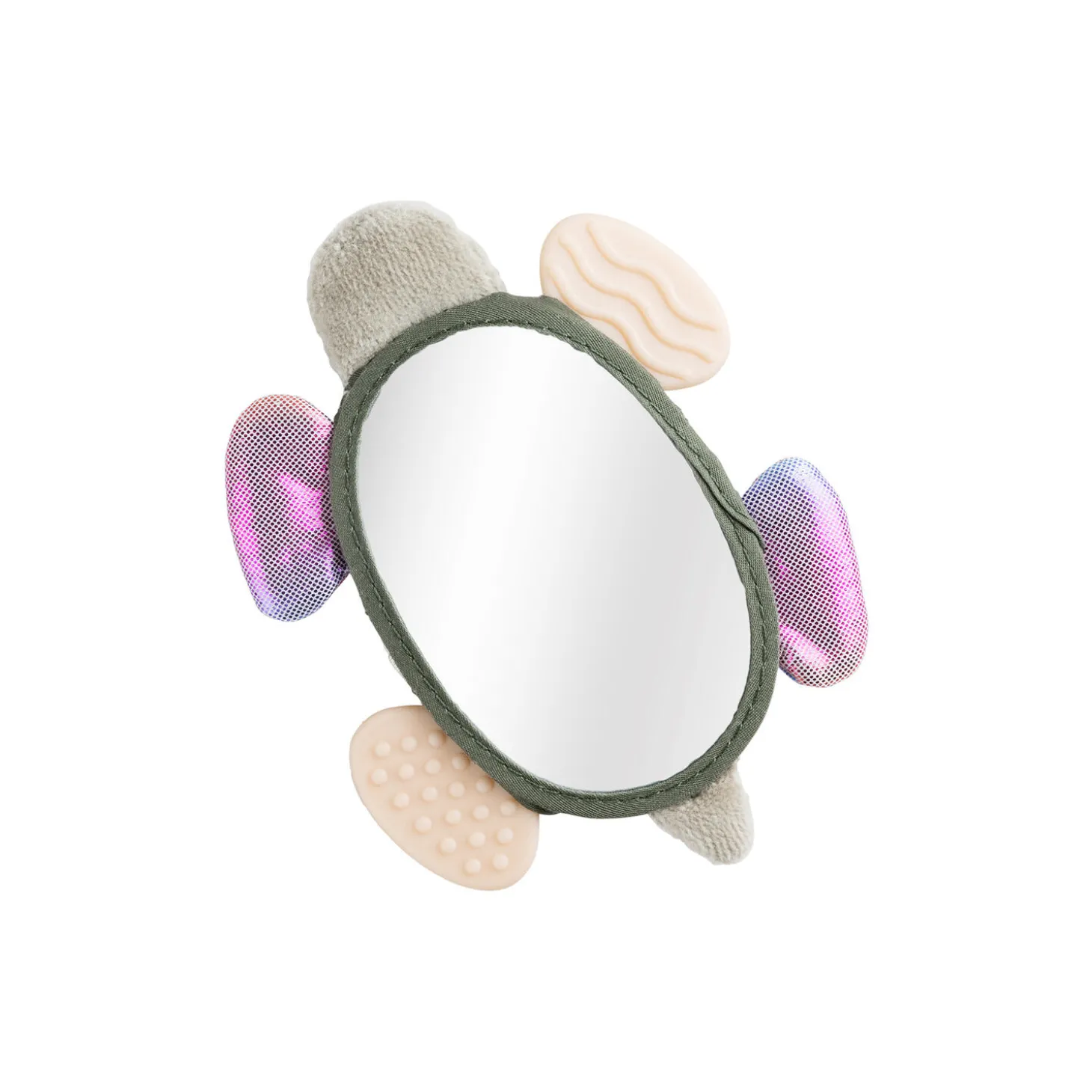 Stimulér alle barnets sanser med skildpadden Turbo – en sød aktivitetsrangle med et babysikkert spejl på maven.