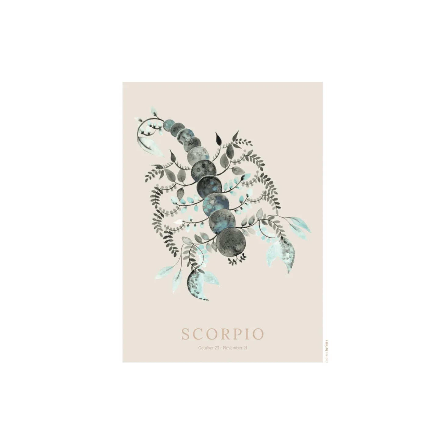 Skorpionen plakat fra All by Voss. Plakatdesign med grafik (tekst) og beige flade under motiv, med trykt hvidt passepartout. Originalen er scannet i høj opløsning for bedst muligt gengivelse. Produceret i Danmark.