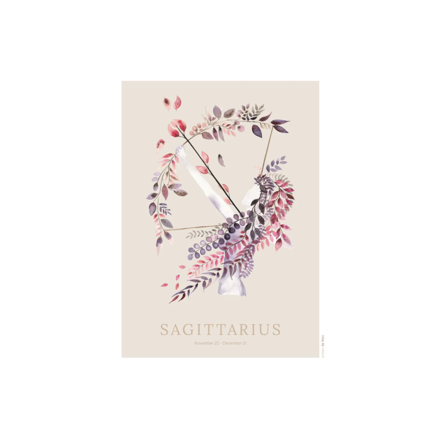 Skytten plakat fra All by Voss. Plakatdesign med grafik (tekst) og beige flade under motiv, med trykt hvidt passepartout. Originalen er scannet i høj opløsning for bedst muligt gengivelse. Produceret i Danmark.
